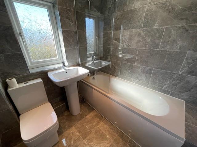 Bathroom - 1.94 x 1.96 (6'4" x 6'5") - White suite comprising of bath with combi fed shower over and glazed screen, WC, pedestal wash hand basin, chrome towel rail, fully tied walls and floor, extractor fan, inset spotlights and Upvc window to rear aspect.