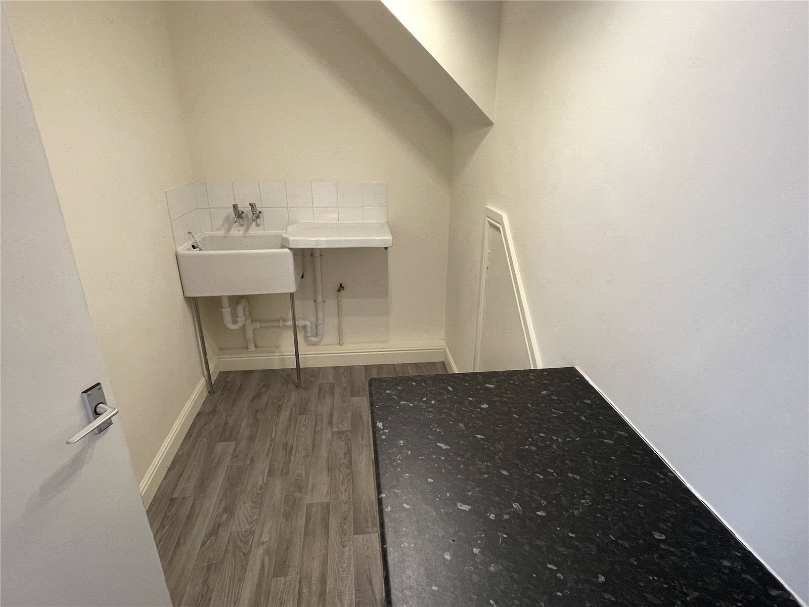 Kitchen 3.37m x 1.56m with Belfast sink, plumbing for washing machine, worktop surface