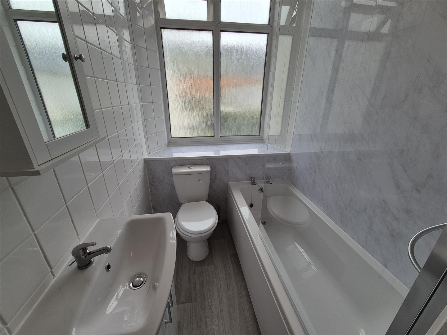 Bathroom - 2.6 x 1.5 (8'6" x 4'11") - Vinyl flooring. White walls, ceiling and paintwork. Obscure double glazed window. White suite with glass shower screen and shower over bath. White wall tiles and grey marble effect wall panels. Enclosed light fitting.