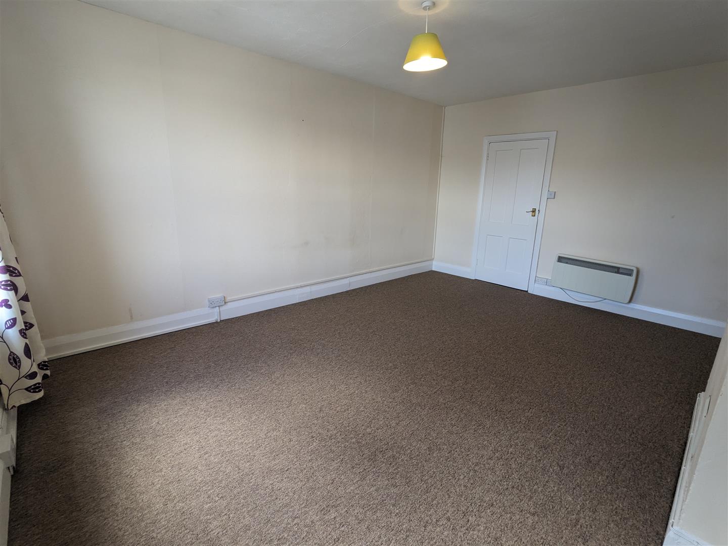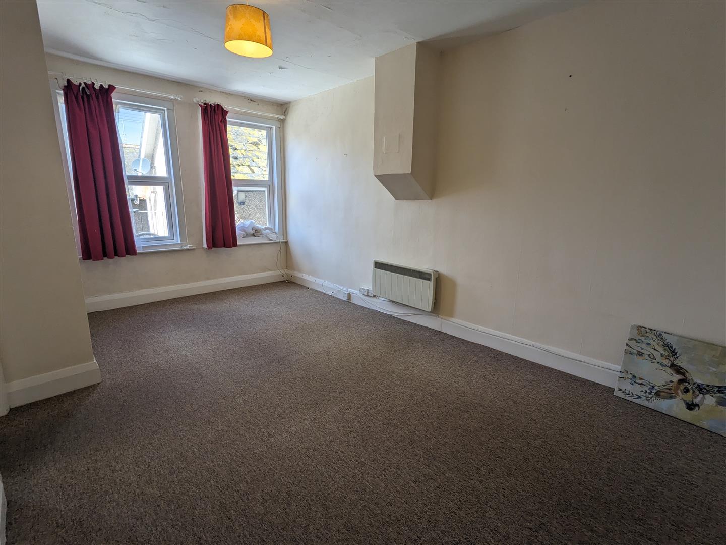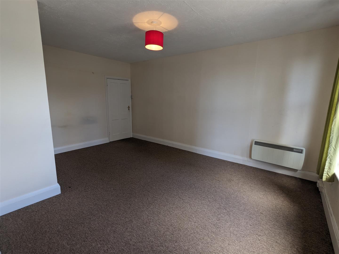 Bedroom One - Large double bedroom. Oatmeal colour fitted carpet. Magnolia walls. White paintwork and ceiling. Pendant light fitting with shade. Double glazed window with red curtains. Night store heater.