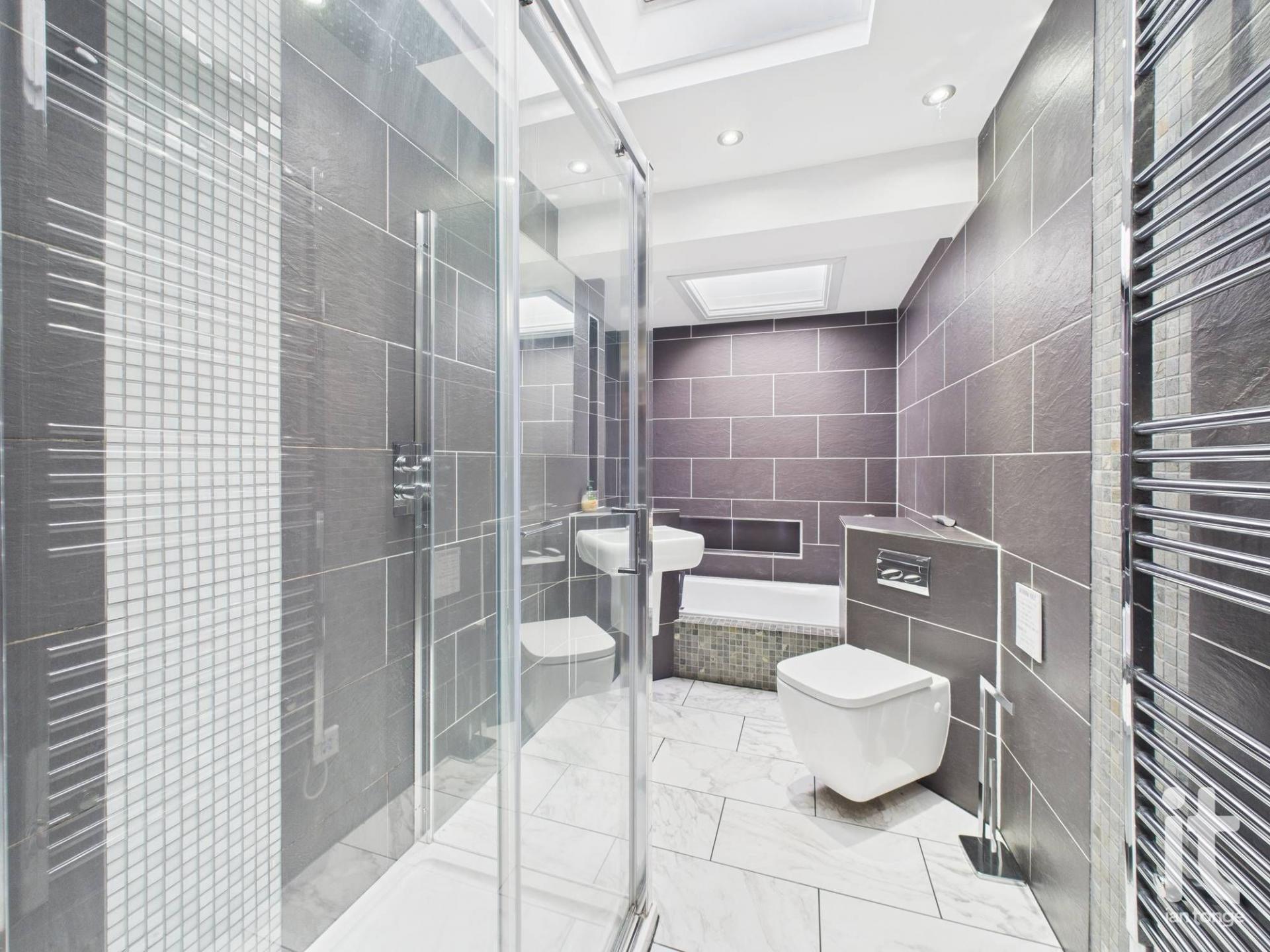 Contemporary bathroom suite comprising of:- walk-in shower unit with large rain shower head and glazed screen, feature sunken Whirlpool bath with tiled sides, hand wash basin and W.C. Chrome heated towel rail, fully tiled walls and flooring, underfloor heating, two electric Velux.