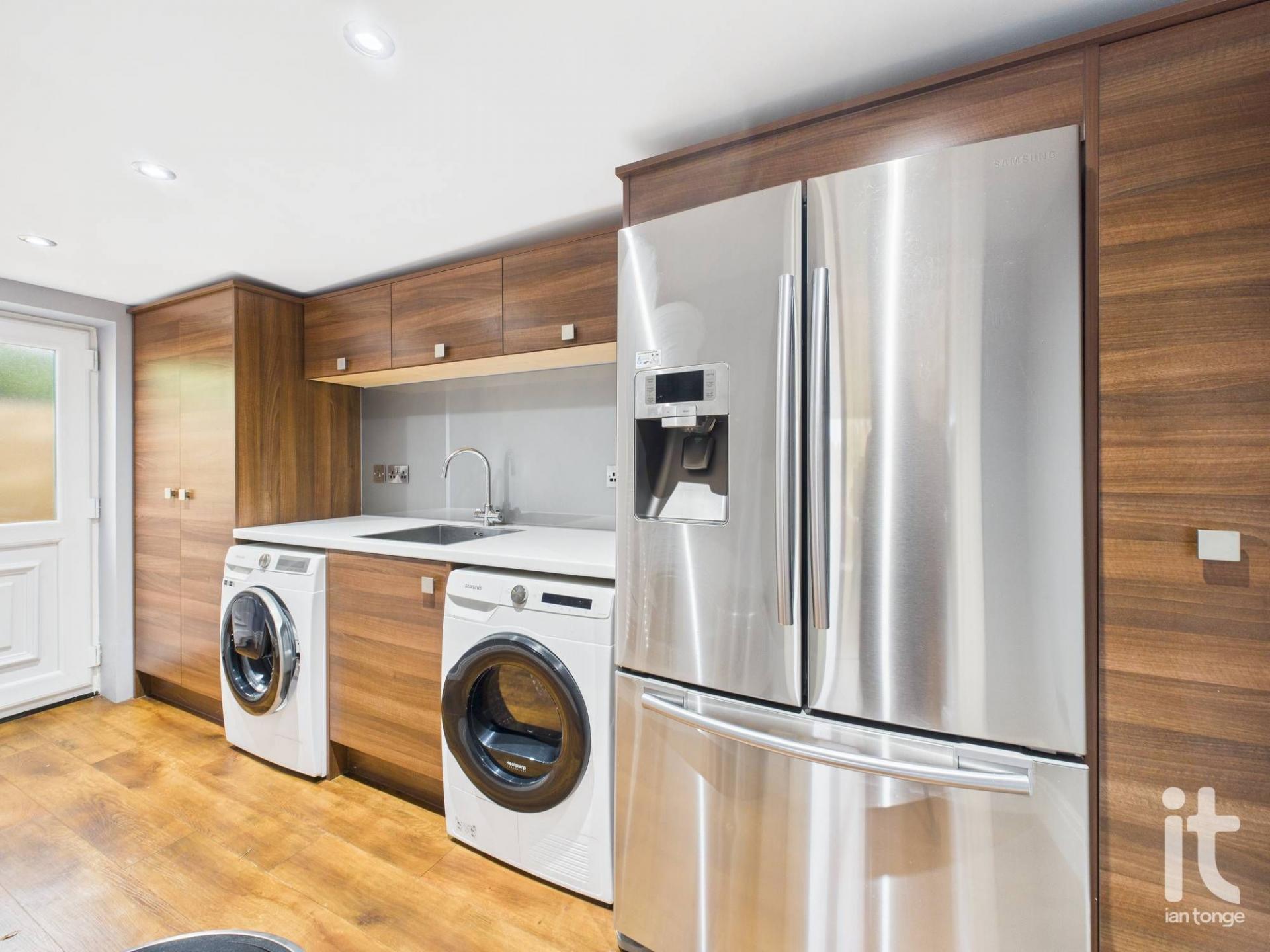 uPVC double glazed door to side aspect, range of fitted wall and base units with worksurfaces incorporating stainless steel sink and mixer tap. American style fridge freezer, washing machine and separate tumble dryer, chrome heated towel rail.