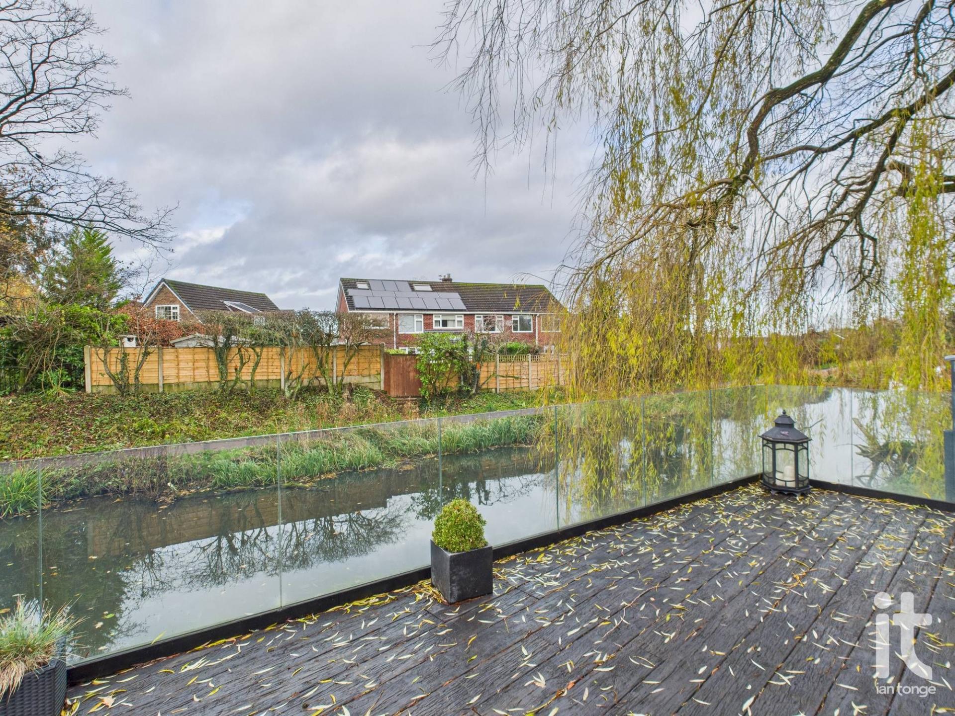 The front of the property has a large flag stoned area for off road parking leading to the attached garage and two side gates giving access to the rear, with mature planting and hedging giving an excellent degree of privacy. The rear garden features two large decked areas, one with glazed balustrade directly overlooking the canal with steps down to the waters edge. There is also a good sized lawned area and is enclosed by mature trees and planting.