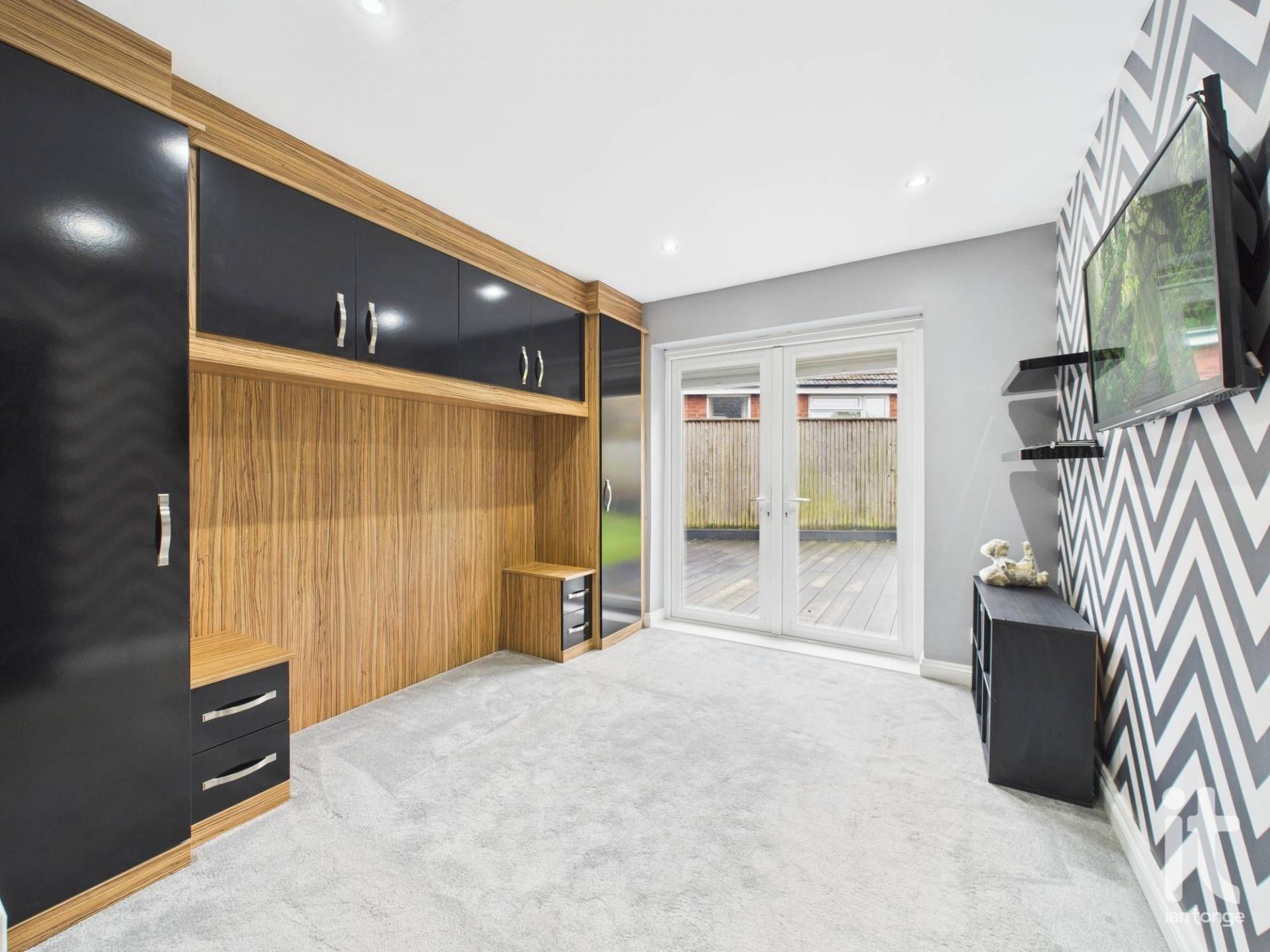 uPVC double glazed French doors leading to decked area and garden to side aspect. Range of fitted wardrobes and overbed storage, radiator.