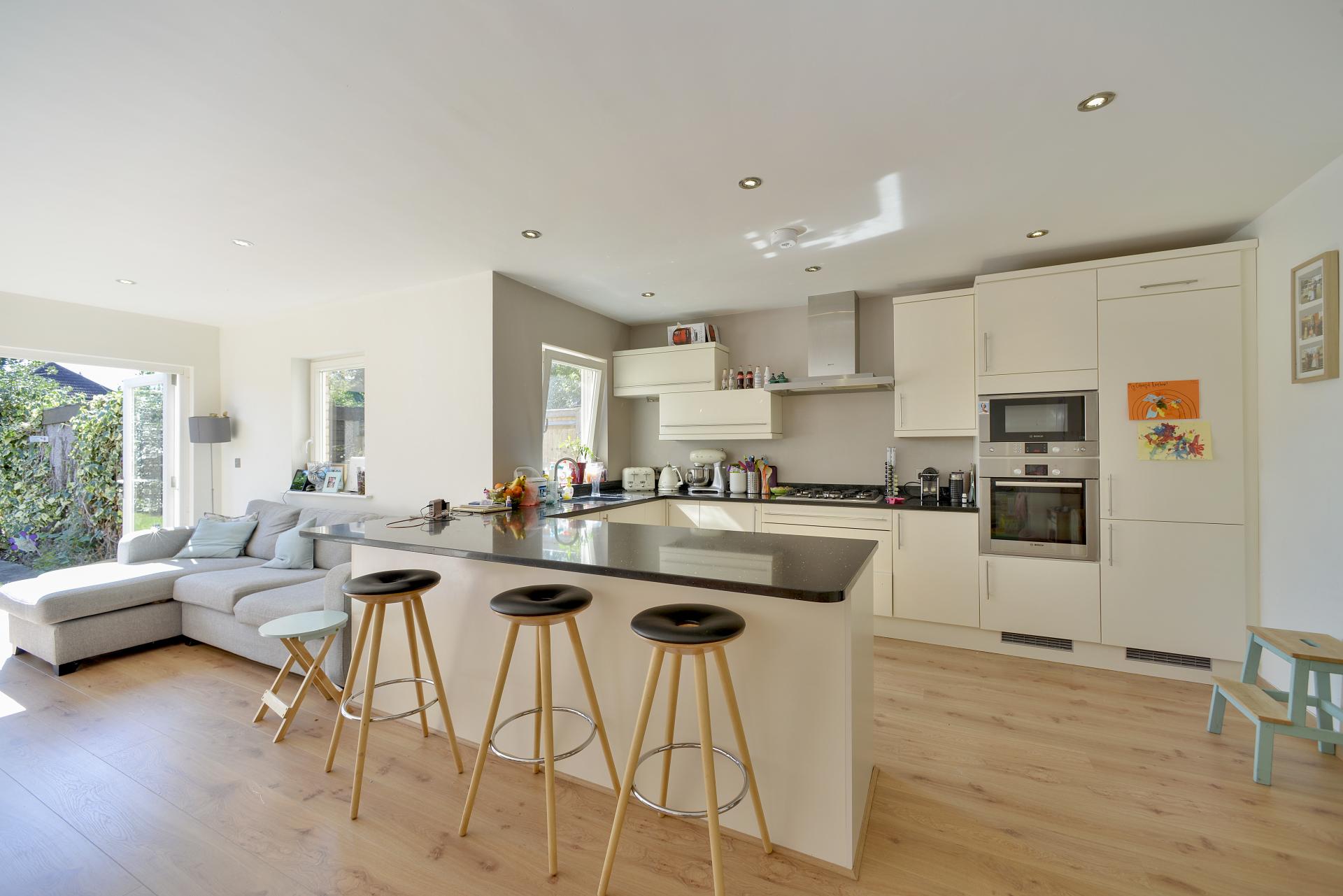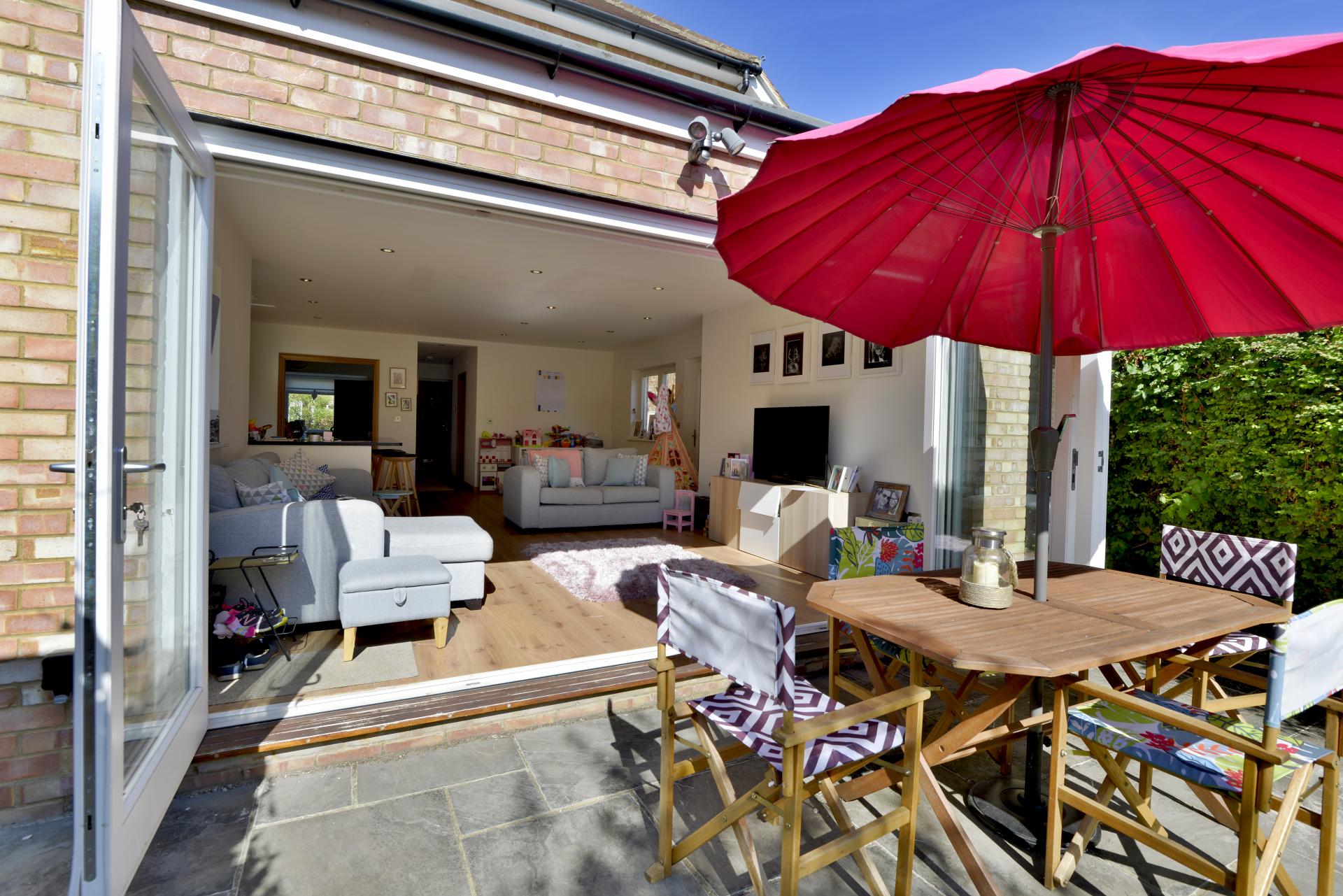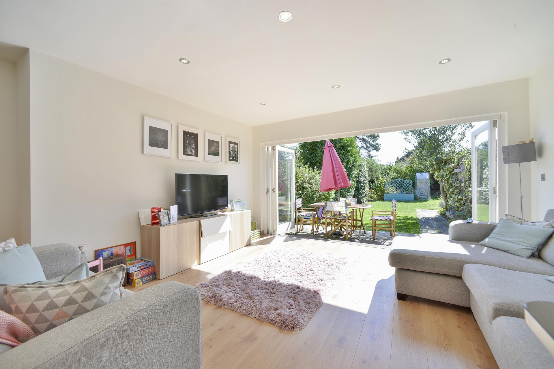 The property features a large open-plan living area with a fully fitted contemporary kitchen and bi-fold doors opening onto the garden, perfect for entertaining. There is also a separate sitting room and a utility/cloakroom.