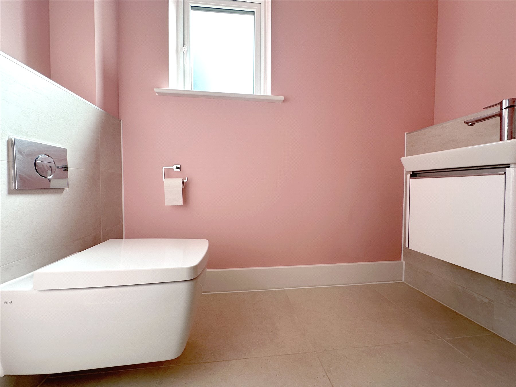 DOWNSTAIRS WC 3'3" × 7'7" (1m × 2.3m). With white hand basin and mixer taps, vanity cupboard below. Triple glazed frosted window and low-level WC with push flush.