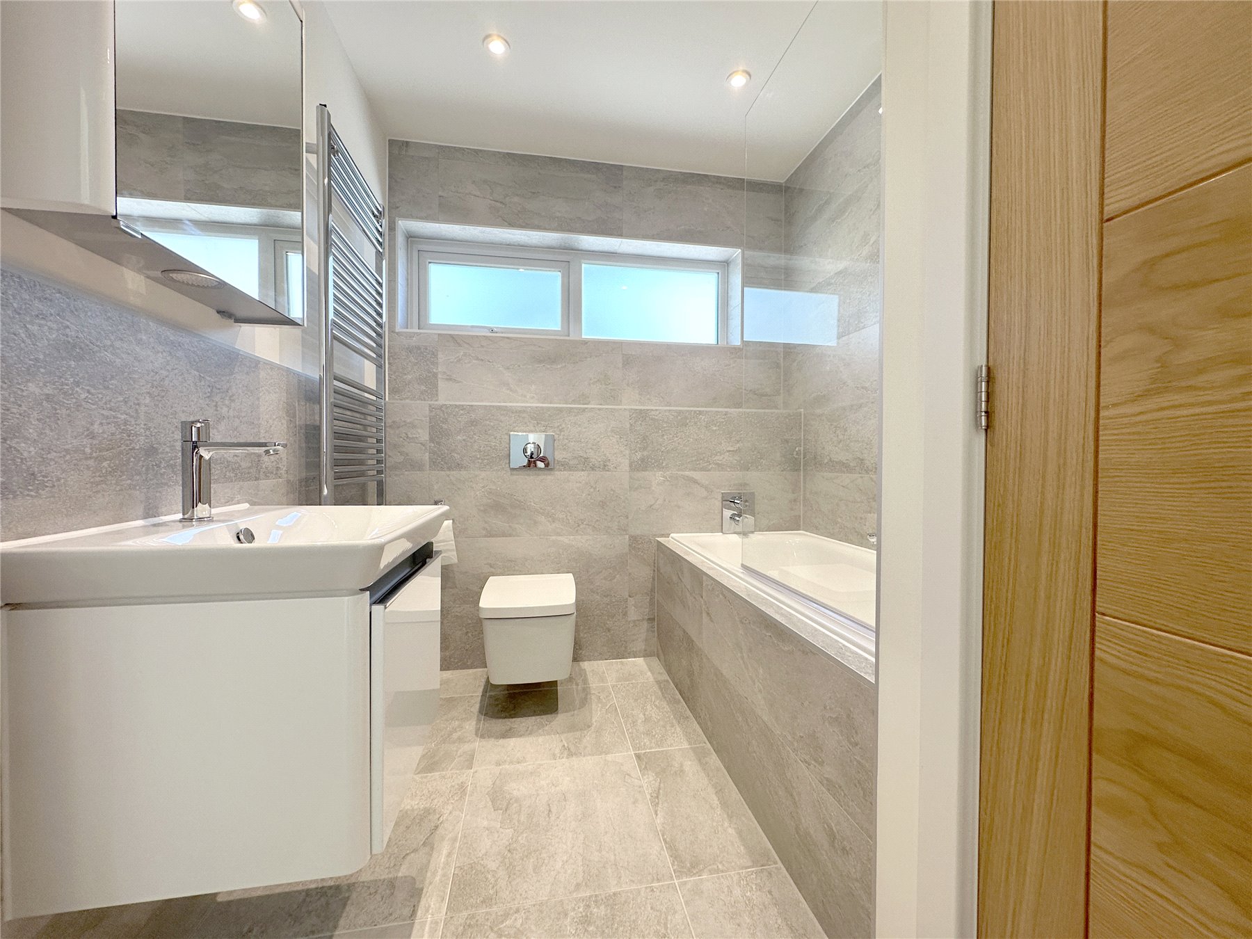 FAMILY BATHROOM Complete with low level WC with push flush. Heated towel rail, handy storage shelf for products. Frosted triple glazed windows. Bath with mixer tap and shower over. White handbasin with vanity drawer below and mirrored vanity above, shaving point and storage cupboard housing the water cylinder.