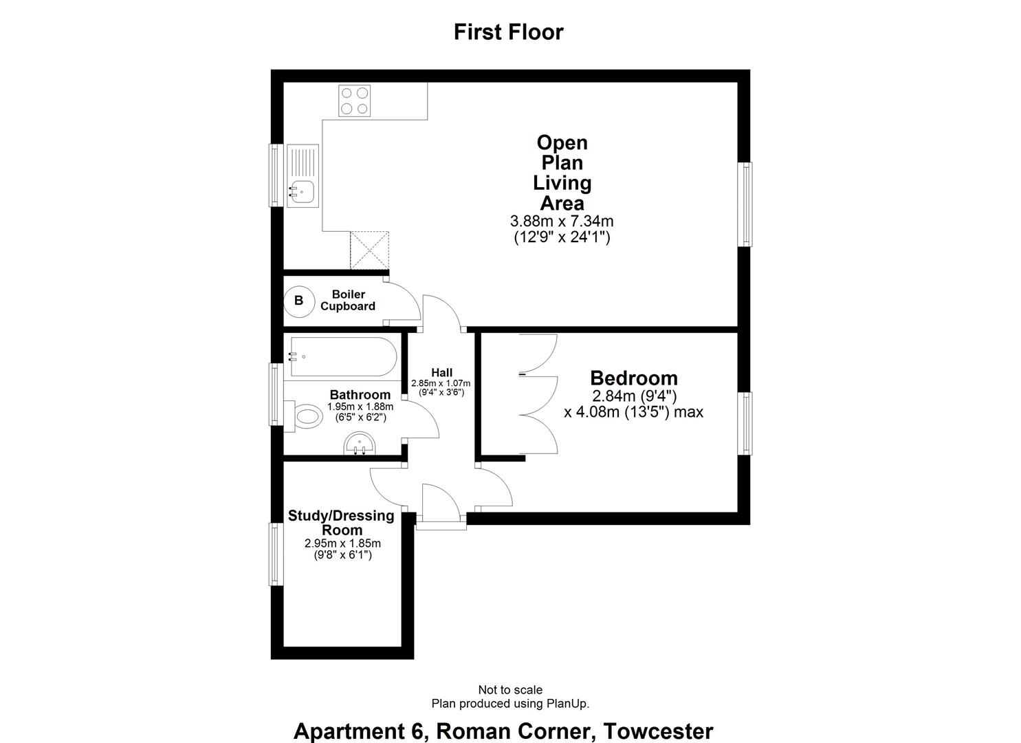 Open Plan Living Area: - 7.34m narrowing to 5.54m x 3.89m (24'1" narrowing - Oak door . Double glazed sash window to the front and rear. A range of soft closing wall and base units in high gloss light Grey with under cabinet lighting, incorporating, stainless steel sink unit, single electric oven, ceramic hob with stainless steel extractor hood above, built in slimline dishwasher and fridge freezer. The kitchen area has ceramic tiled flooring with engineered Oak to the living area. T.V. Points. Telephone Point, Recessed ceiling lights. Two electric wall mounted heaters. Boiler cupboard.