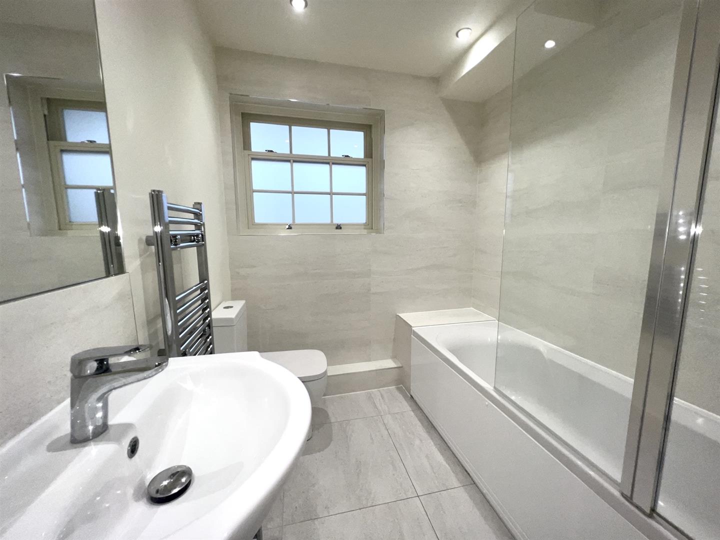 Bathroom: - 1.96m x 1.88m (6'5" x 6'2") - Oak door. Double glazed sash window to the rear with obscure glazing. White low level W.C., wash hand basin in a White gloss vanity unit, bath with shower and screen over. Stainless steel ladder radiator. Recessed ceiling lights, Wall mounted mirror. Tiled flooring.