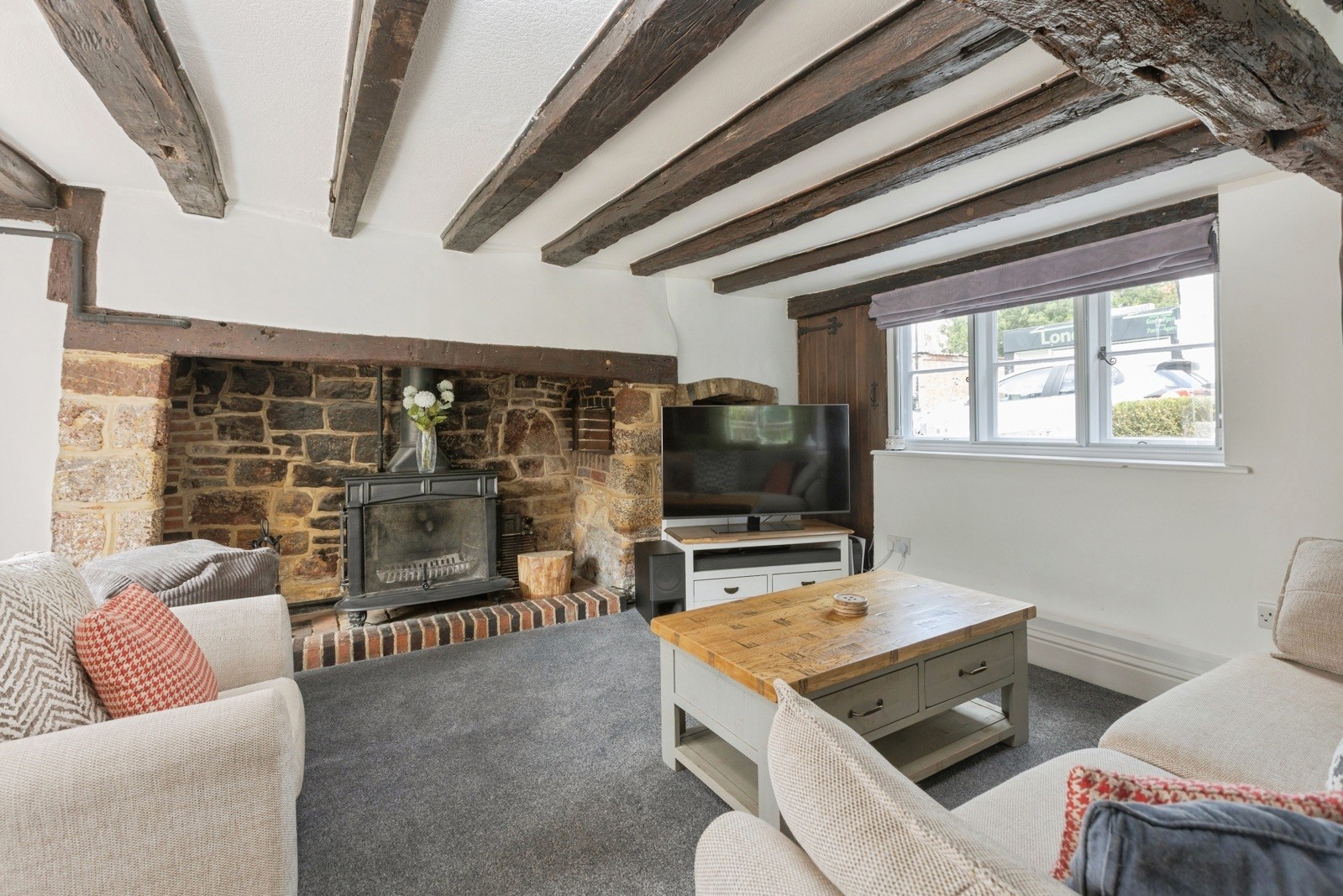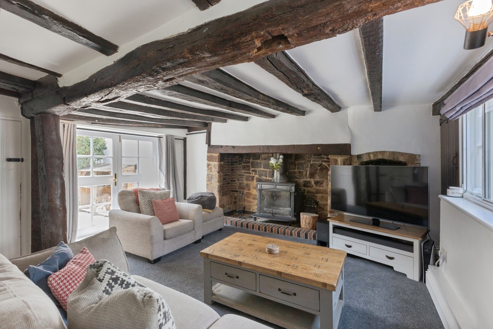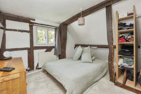 The ground floor features a stunning open-plan living and dining area, complete with a large inglenook fireplace and wood-burning stove, creating a warm and inviting focal point. French doors open directly onto the rear garden, enhancing the sense of space and light. The well-appointed kitchen includes a traditional butler sink and provides direct access to the garden. Stairs rise to the first floor, where there are two bedrooms and a bathroom. Throughout the property there is a wealth of period features, including exposed ceiling and wall timbers. The cottage is heated via an oil-fired central heating system.