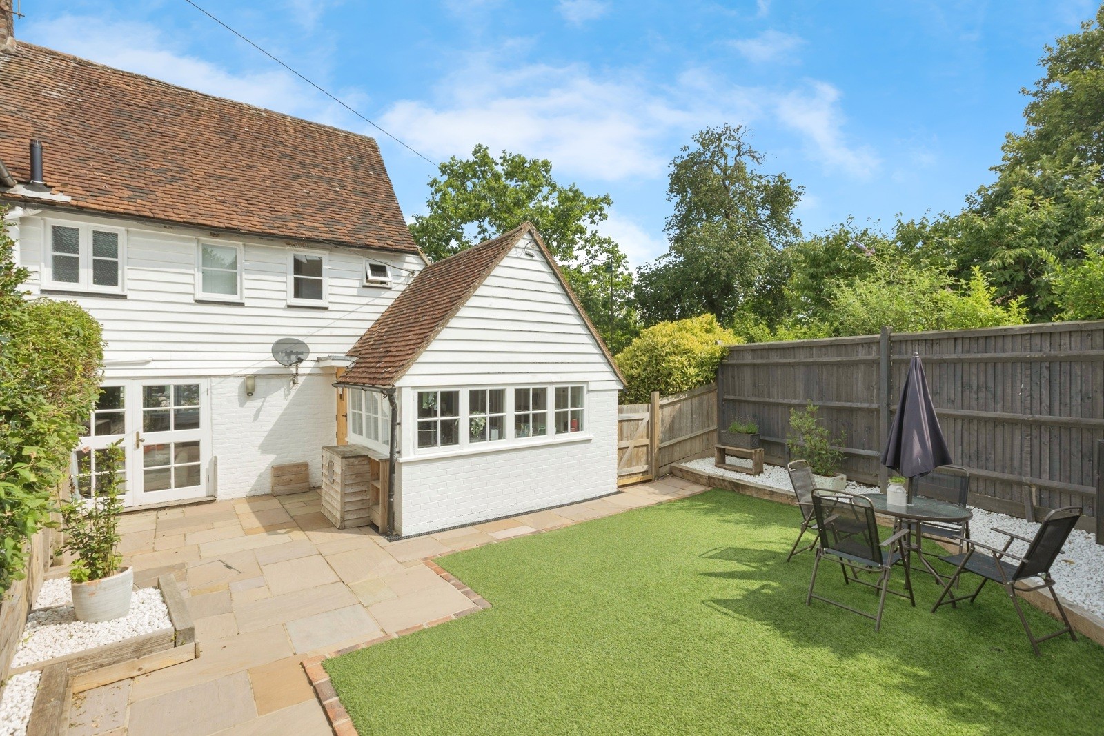 To the front is a white picket fence-enclosed garden, with gated side access leading to the low-maintenance rear garden, which offers an ideal space for entertaining family and friends. To the rear of the property is a converted garage offering a variety of potential uses, together with an allocated parking space.