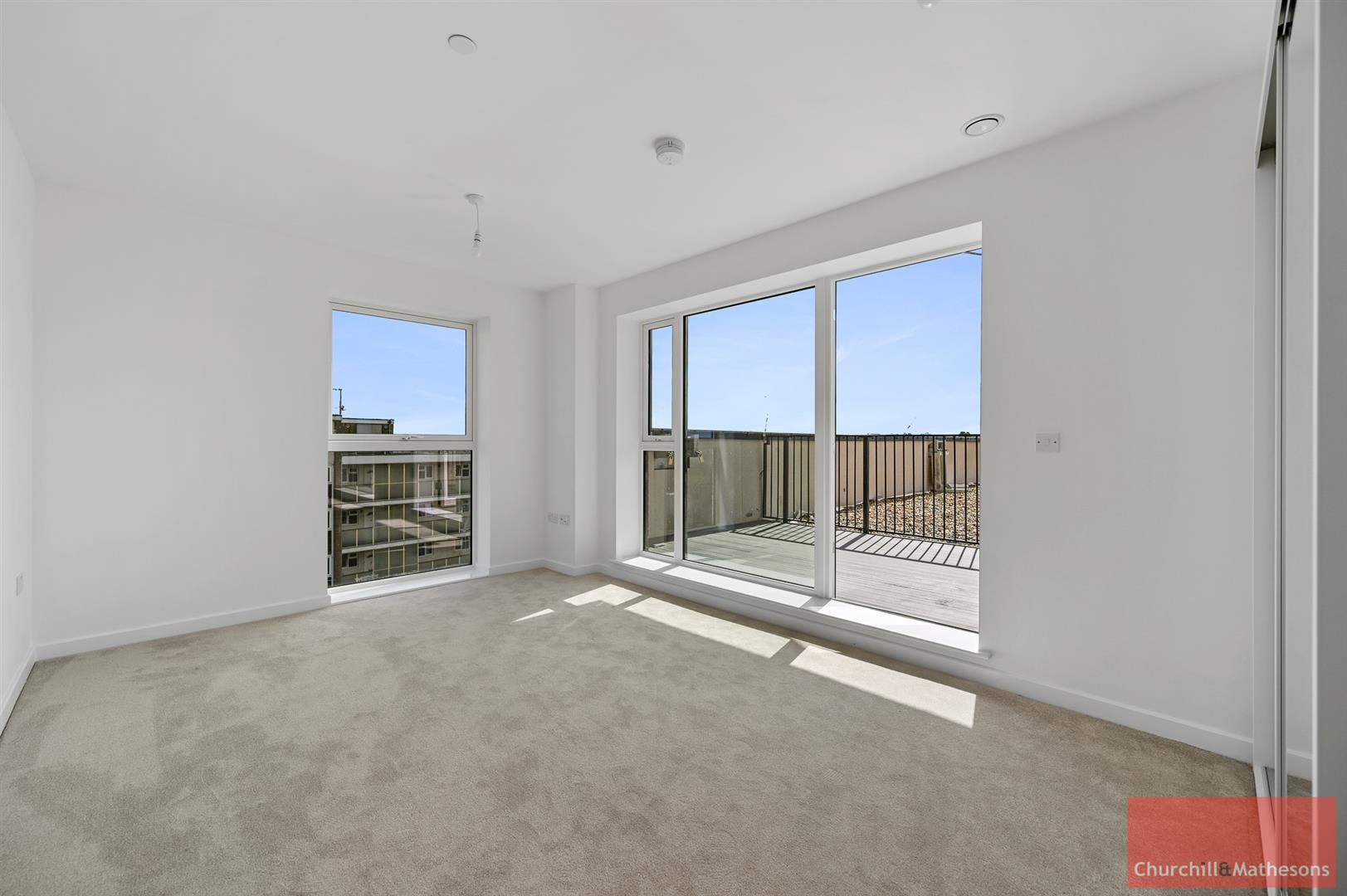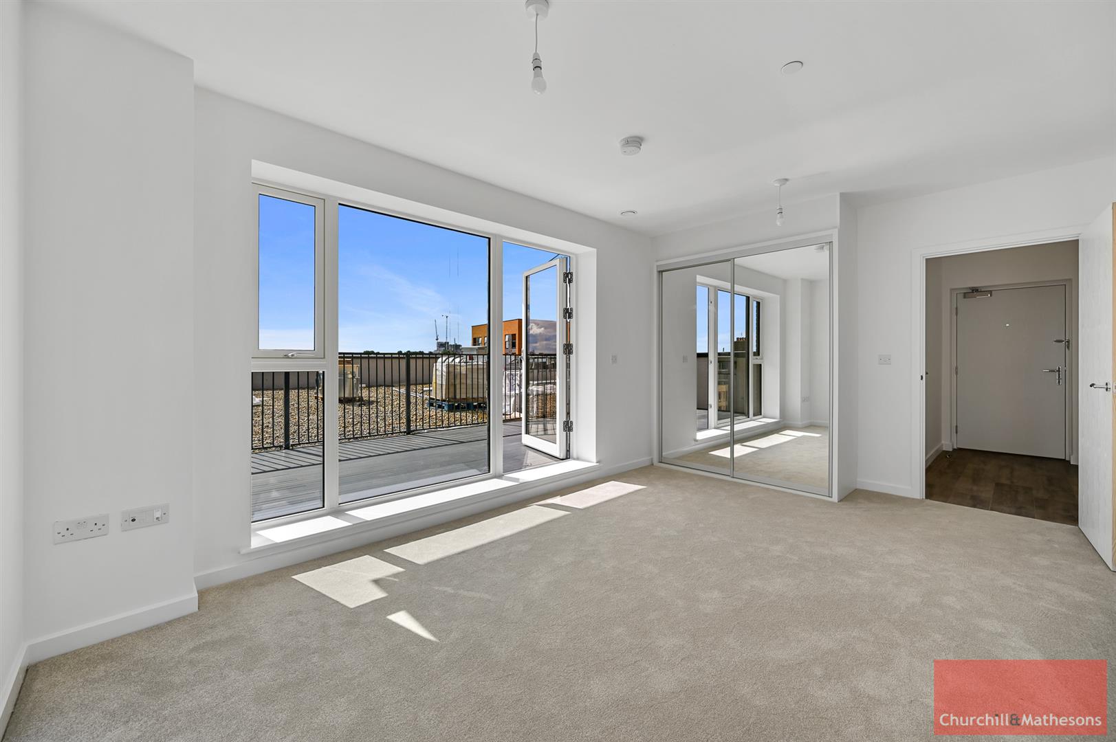Open plan reception room with balcony doors opening to a roof terrace