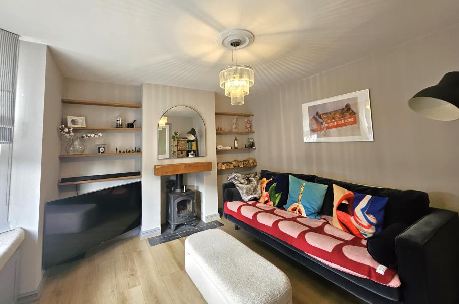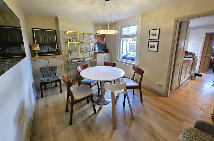 The ground floor offers a front-aspect lounge with a charming log burner, a separate dining room, and a refitted kitchen featuring a Rangemaster oven and underfloor heating. There is also a modern refitted bathroom with underfloor heating.