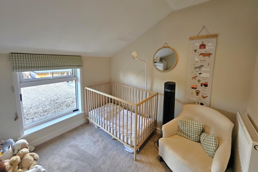Upstairs comprises a spacious master bedroom with feature fireplace, a second double bedroom with fitted wardrobes, and a further single bedroom.