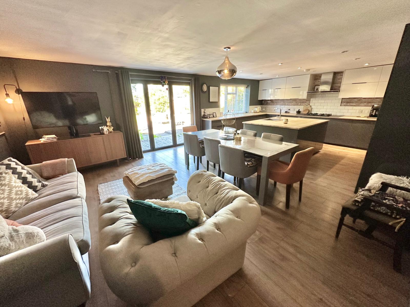 The spacious ground floor accommodation comprises a stunning open plan kitchen/dining/living space with bi folding doors out to the west facing garden, an island unit and a range of integrated appliances including separate fridge and freezer, dishwasher, waist height oven & microwave as well as a five-ring gas hob.