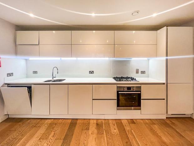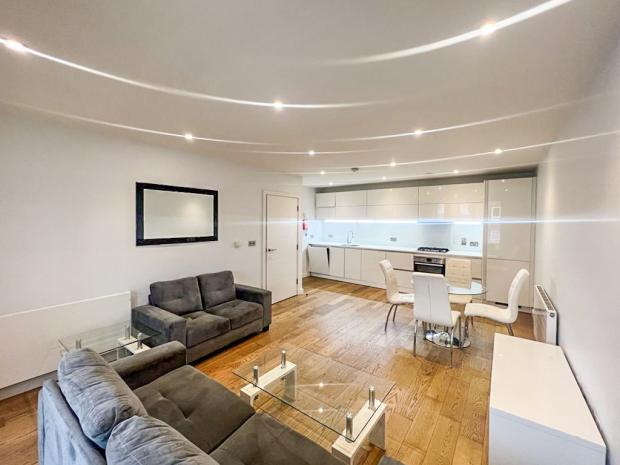 Comprising of a large open plan kitchen/living area with fully integral appliances including a dishwasher, solid wood flooring and a terrace running one side of the lounge. Two double bedrooms (one with ensuite shower room & fitted wardrobes) and the other one with balcony, both are carpeted, separate contemporary bathroom, large floor to ceiling windows, entry phone intercom system, gas central heating and a private terrace.
