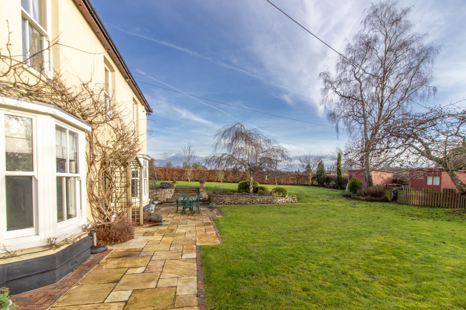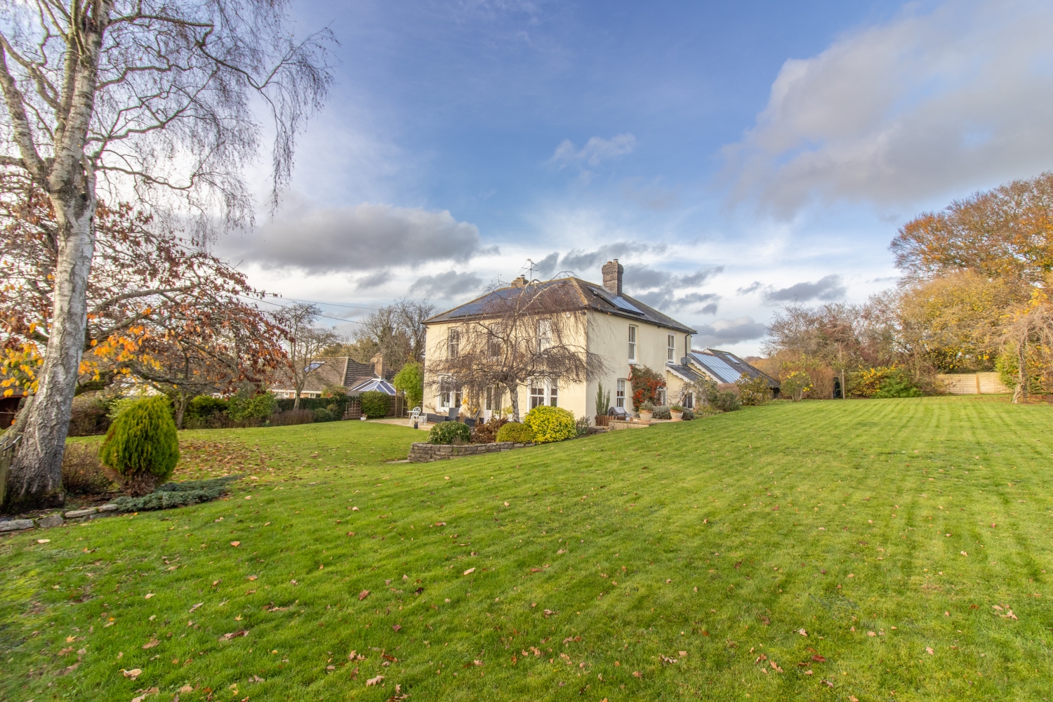 Located down a quiet lane, the property boasts a large driveway providing ample parking for several cars and access to the double garage. To the sides and rear there is a large South-facing landscaped garden, with lawns, mature trees and shrubs and a paved patio, ideal for entertaining.