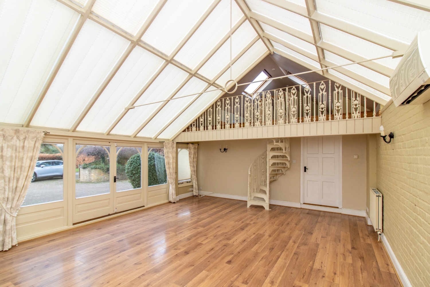 From the front door, there is a welcoming entrance hallway with doors through to the principal rooms. The modern kithchen / breakfast room has a range of painted units with granite worktops, a butler sink and a range cooker. There is ample space for a kitchen table. Double doors lead through to the impressive dining room with bay window. The sitting room, which is naturally well lit, benefits from a double aspect including a large bay window overlooking the rear garden. There is a study, downstairs shower room. an utility room. From the hall, double doors open into the delightful family room, with vaulted glass ceiling and spiral stairs up to a further reception room.