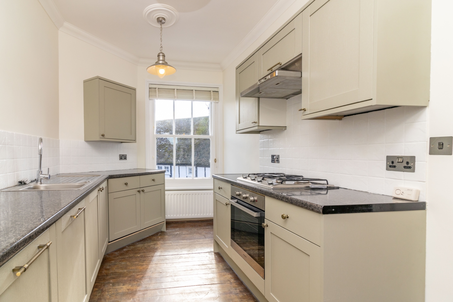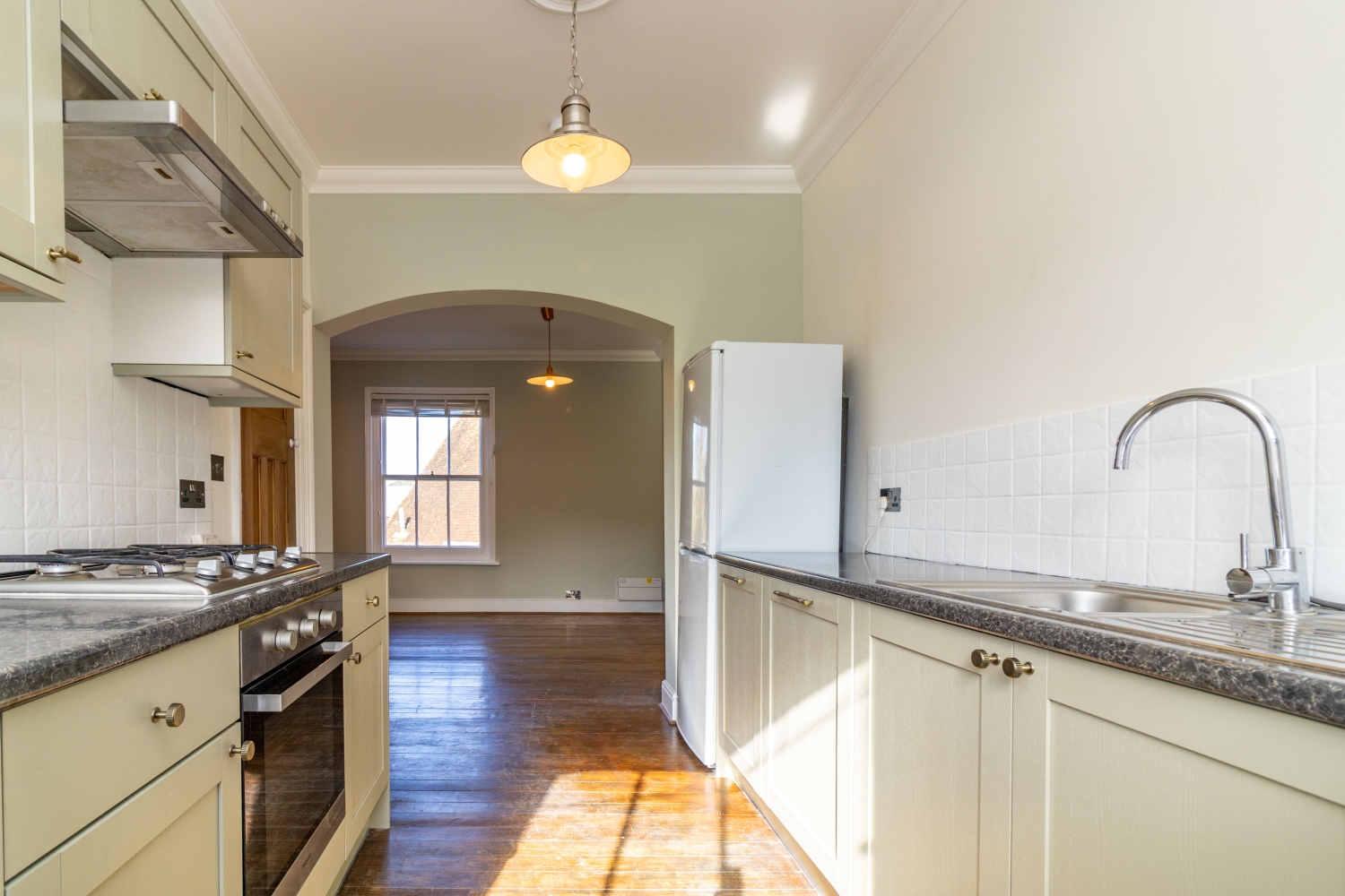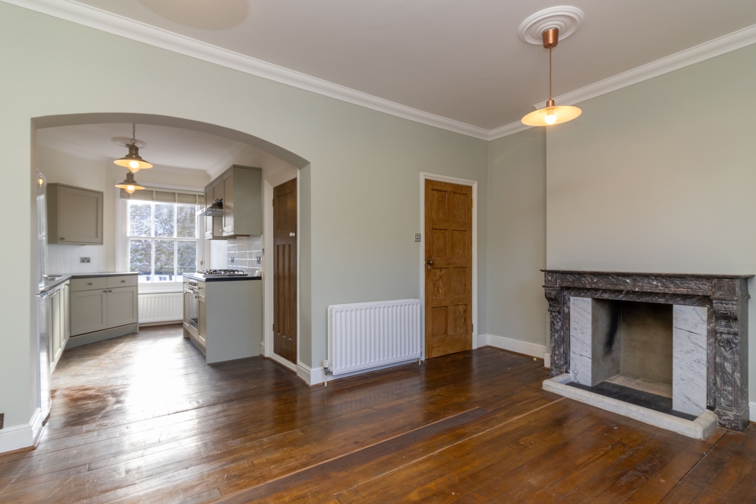 Recently refurbished, the apartment has its own front door which opens into a hallway. Upstiars is the landing, with a door through to the bathroom, which features a white suite with shower over the bath. There are three double bedrooms, all with feature decorative fireplaces. There is an open plan sitting room / kitchen, with exposed floorboards and period decorative fireplace. The kitchen has a range of base and eye-level units and a larder cupboard.