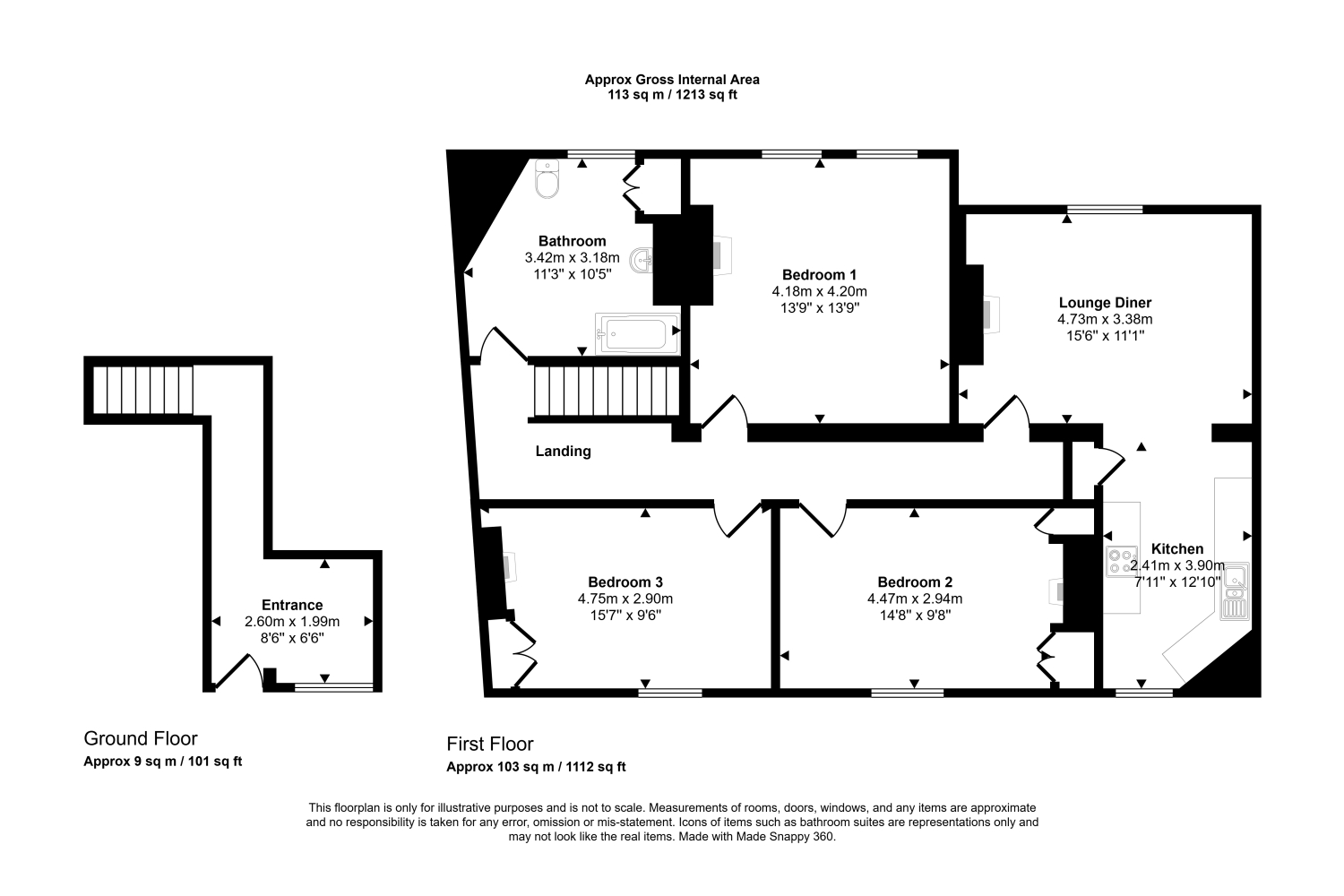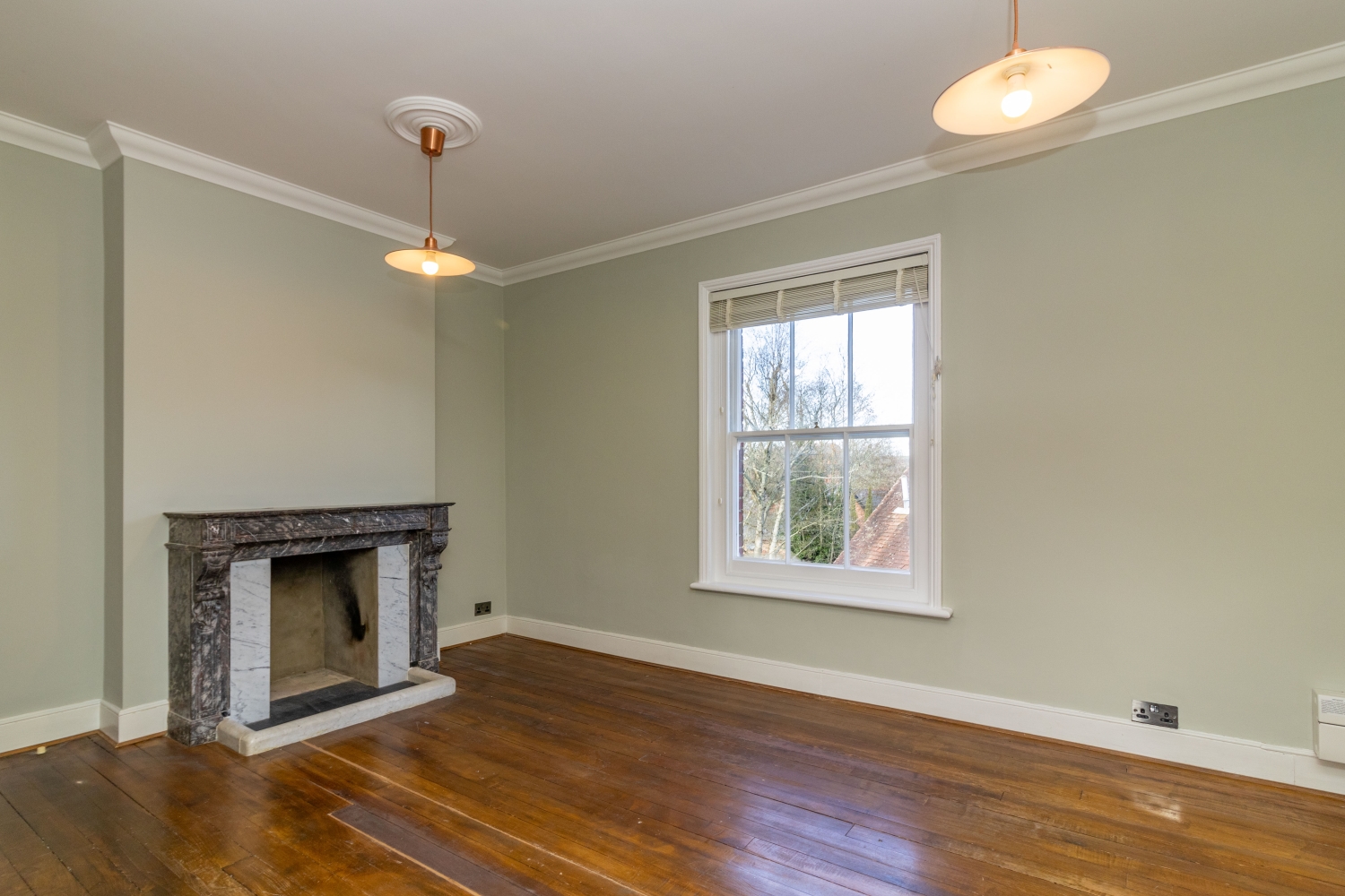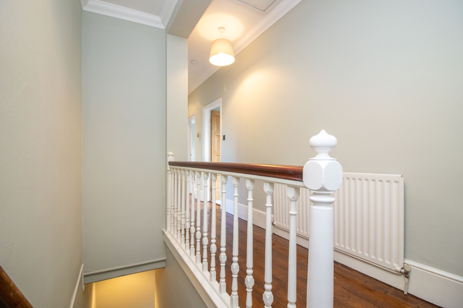 Recently refurbished, the apartment has its own front door which opens into a hallway. Upstiars is the landing, with a door through to the bathroom, which features a white suite with shower over the bath. There are three double bedrooms, all with feature decorative fireplaces. There is an open plan sitting room / kitchen, with exposed floorboards and period decorative fireplace. The kitchen has a range of base and eye-level units and a larder cupboard.