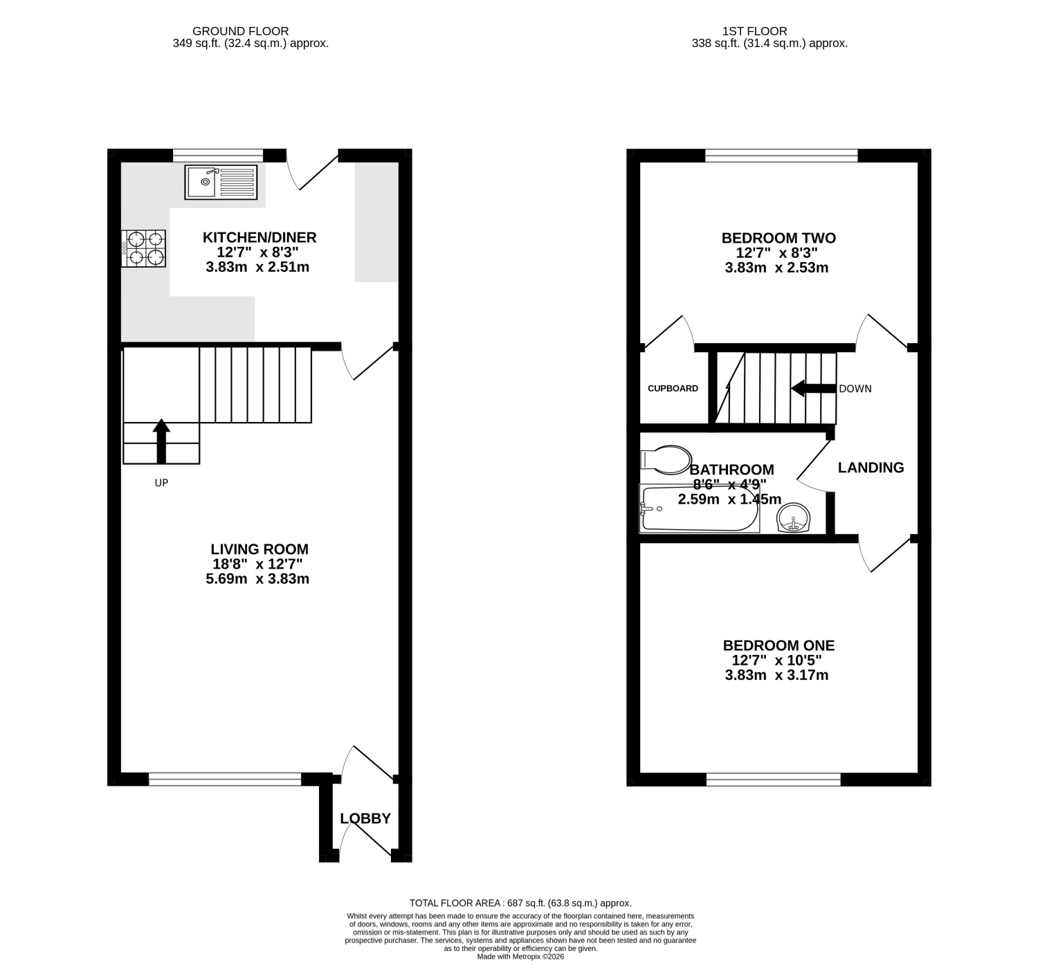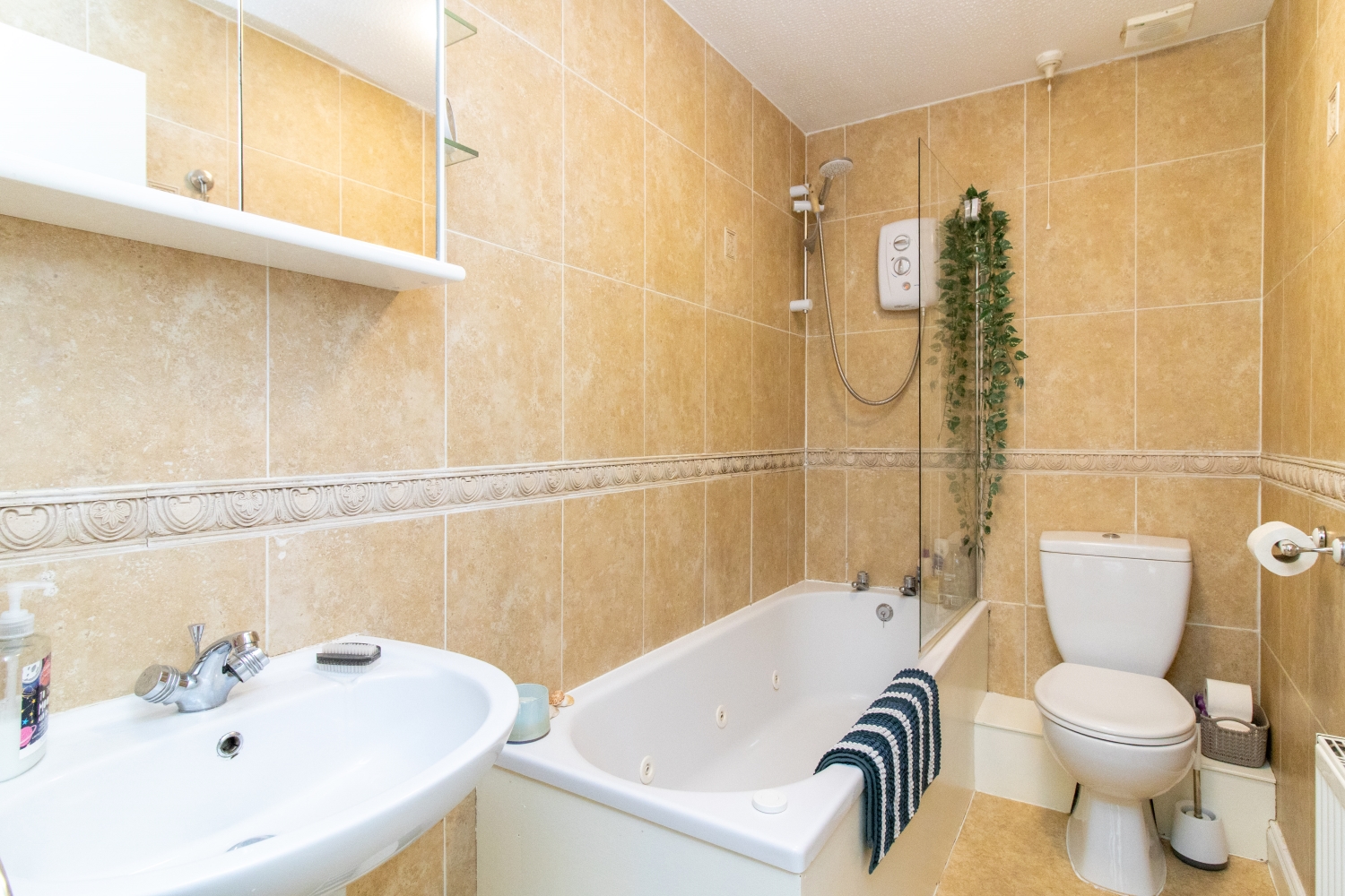 On the first floor, the main bedroom is at the front of the house. The second bedroom overlooks the garden. There is a family bathroom, with a suite comprising a bath, pedestal wash hand basin and a wc.