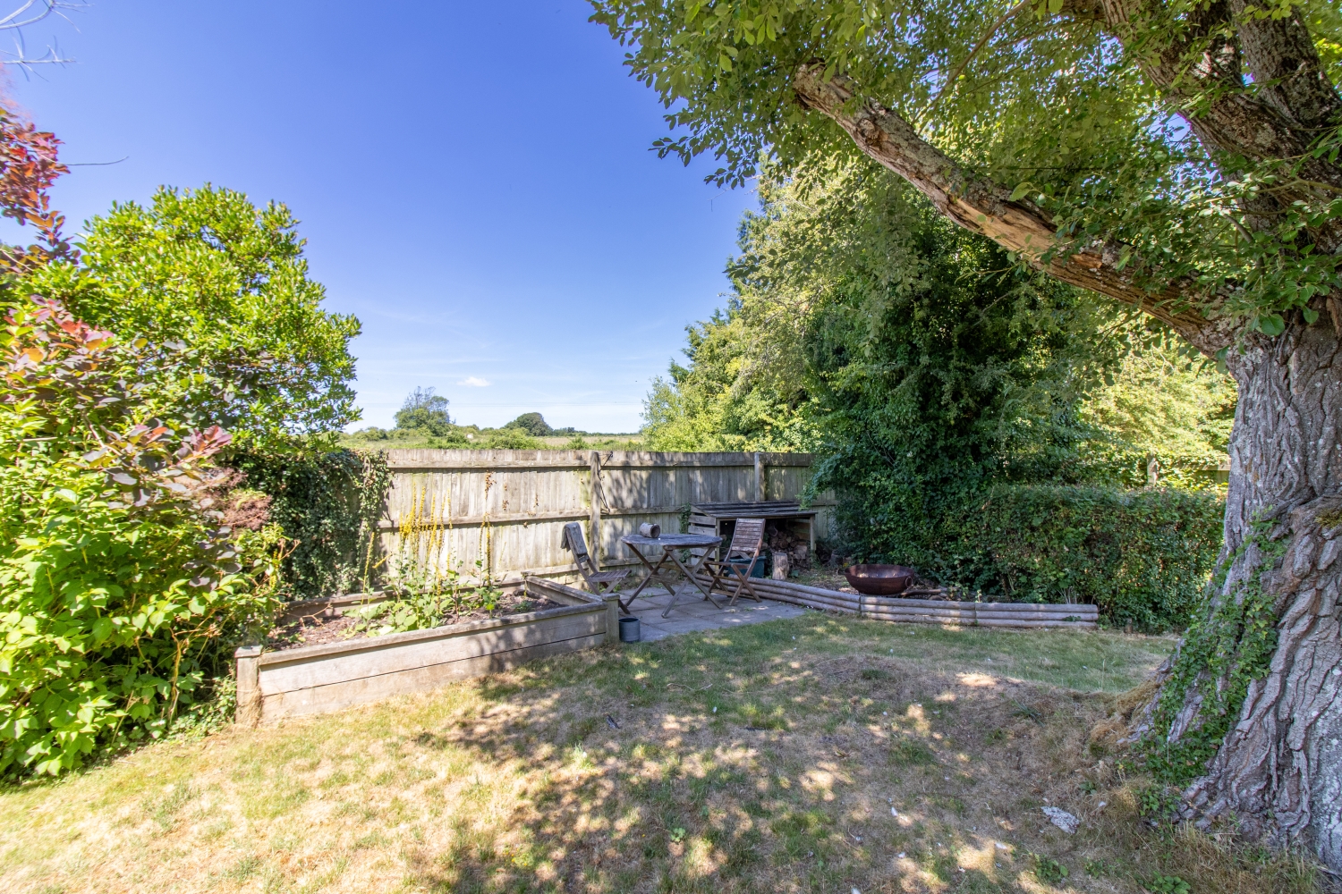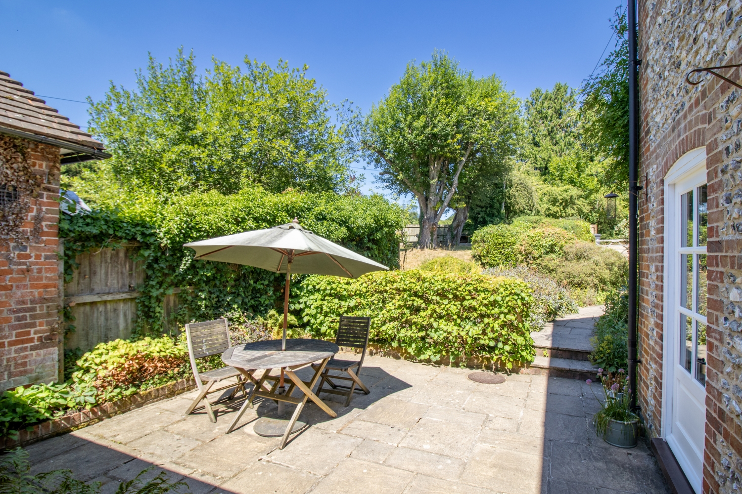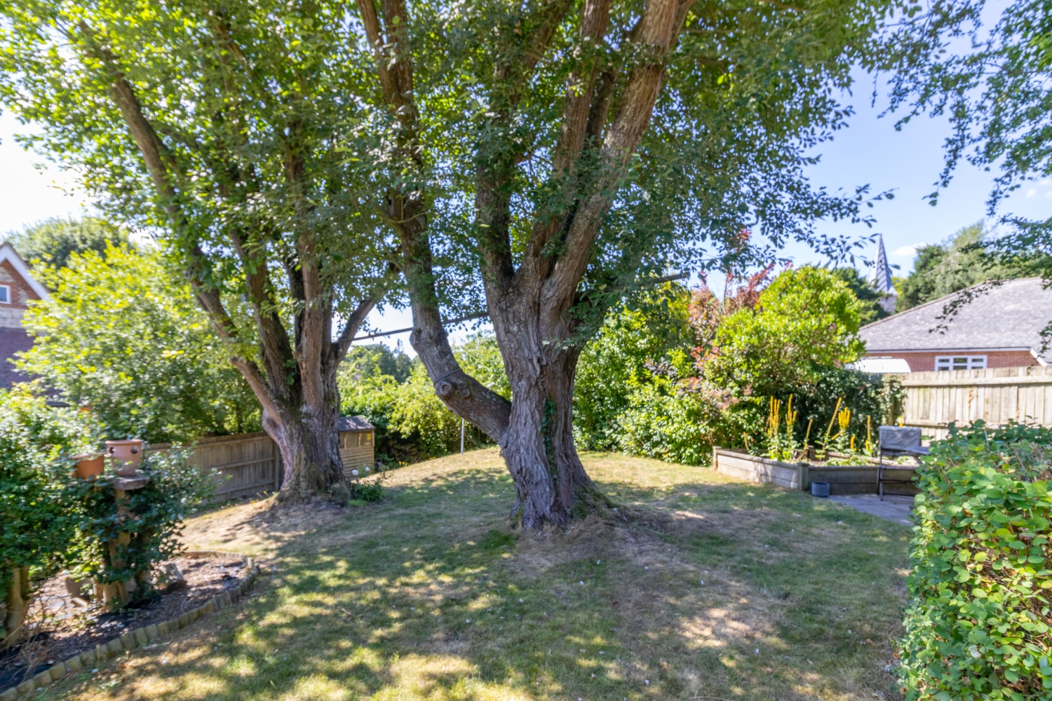 The pretty garden includes a patio area and raised lawn, with mature shrubs and trees.