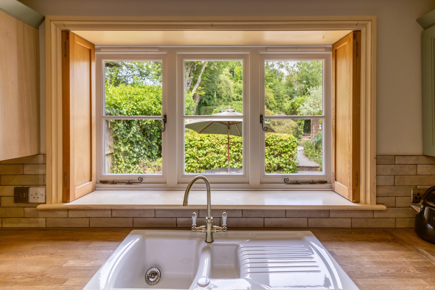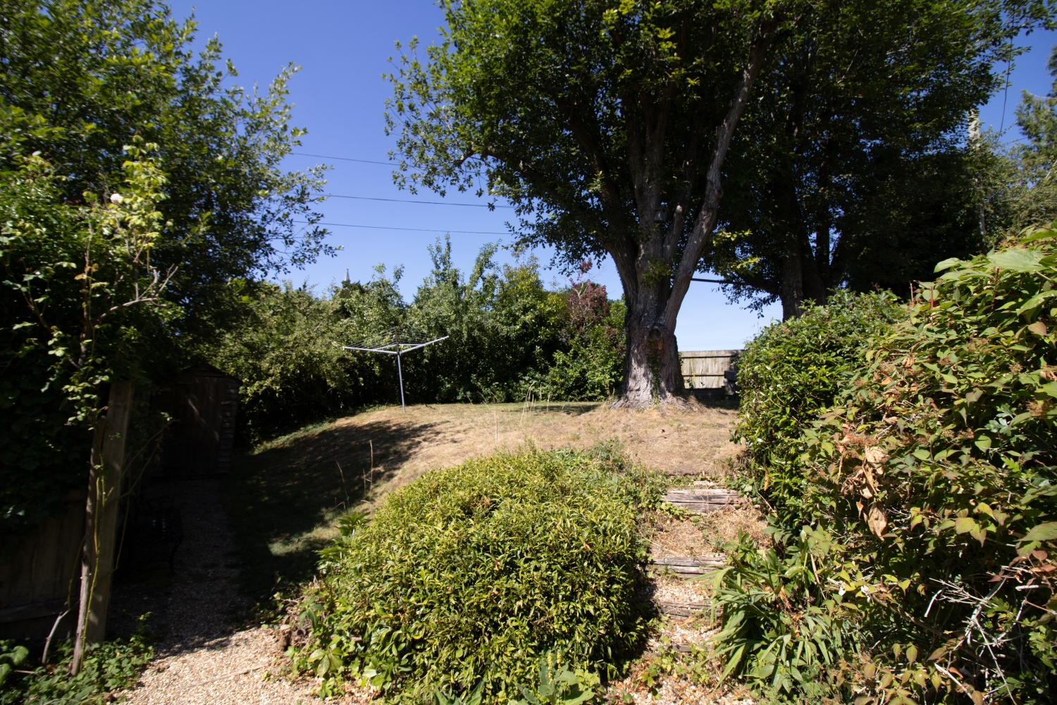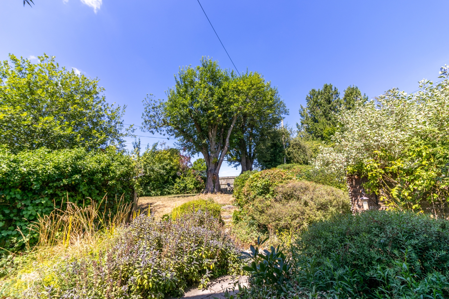 The pretty garden includes a patio area and raised lawn, with mature shrubs and trees.