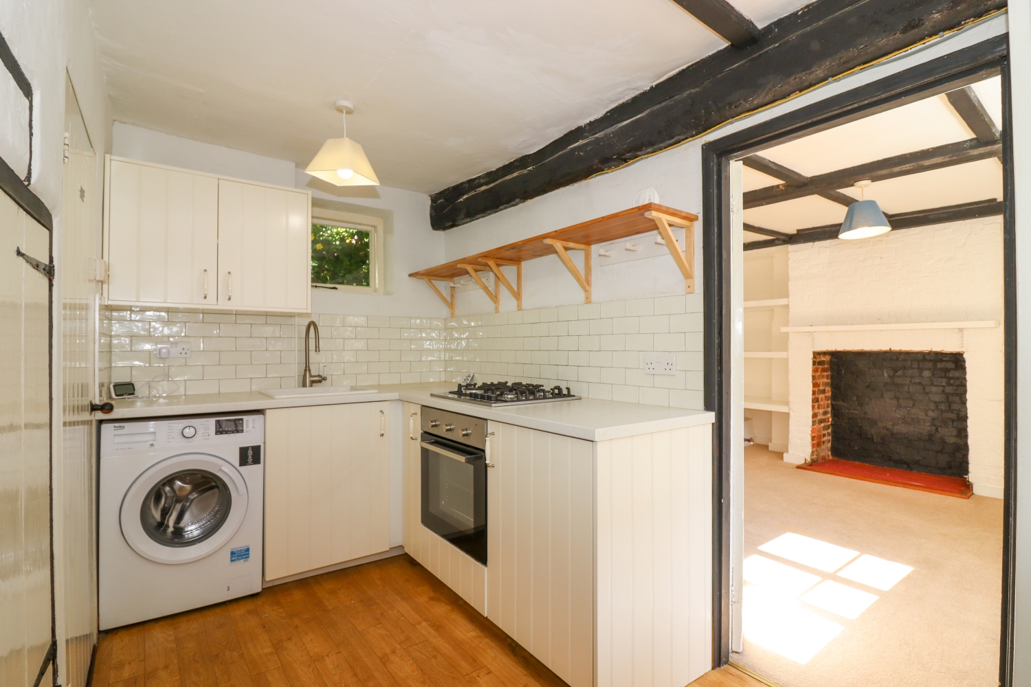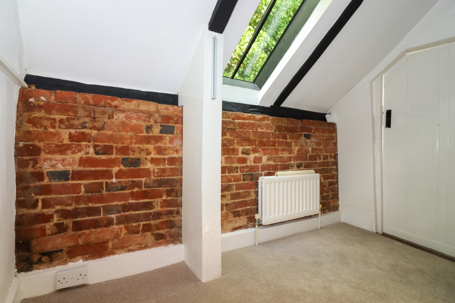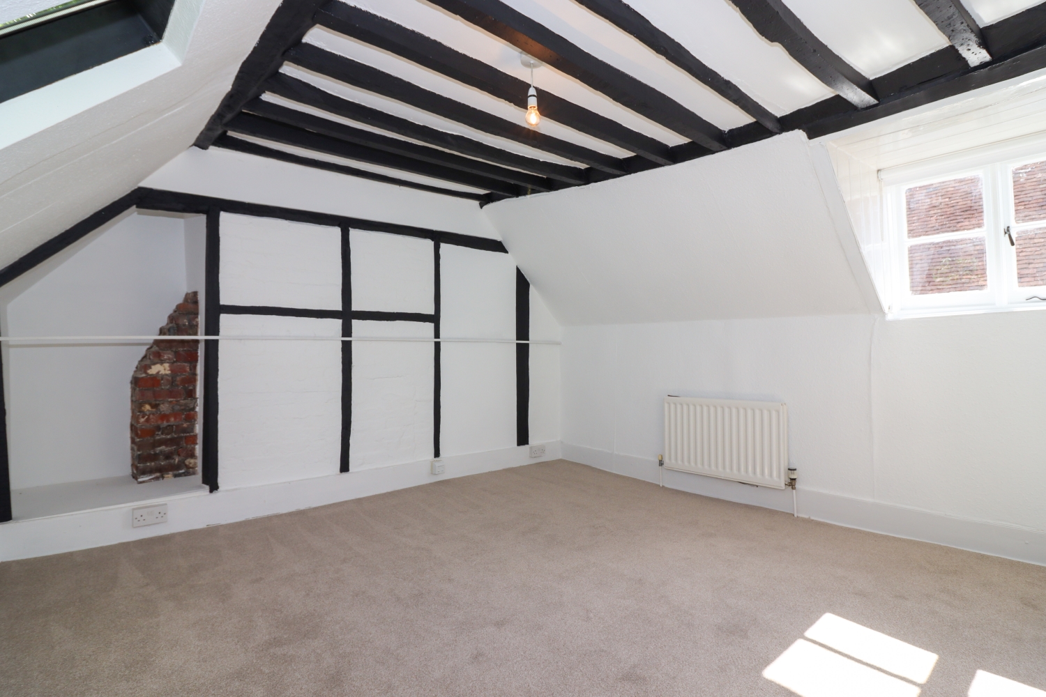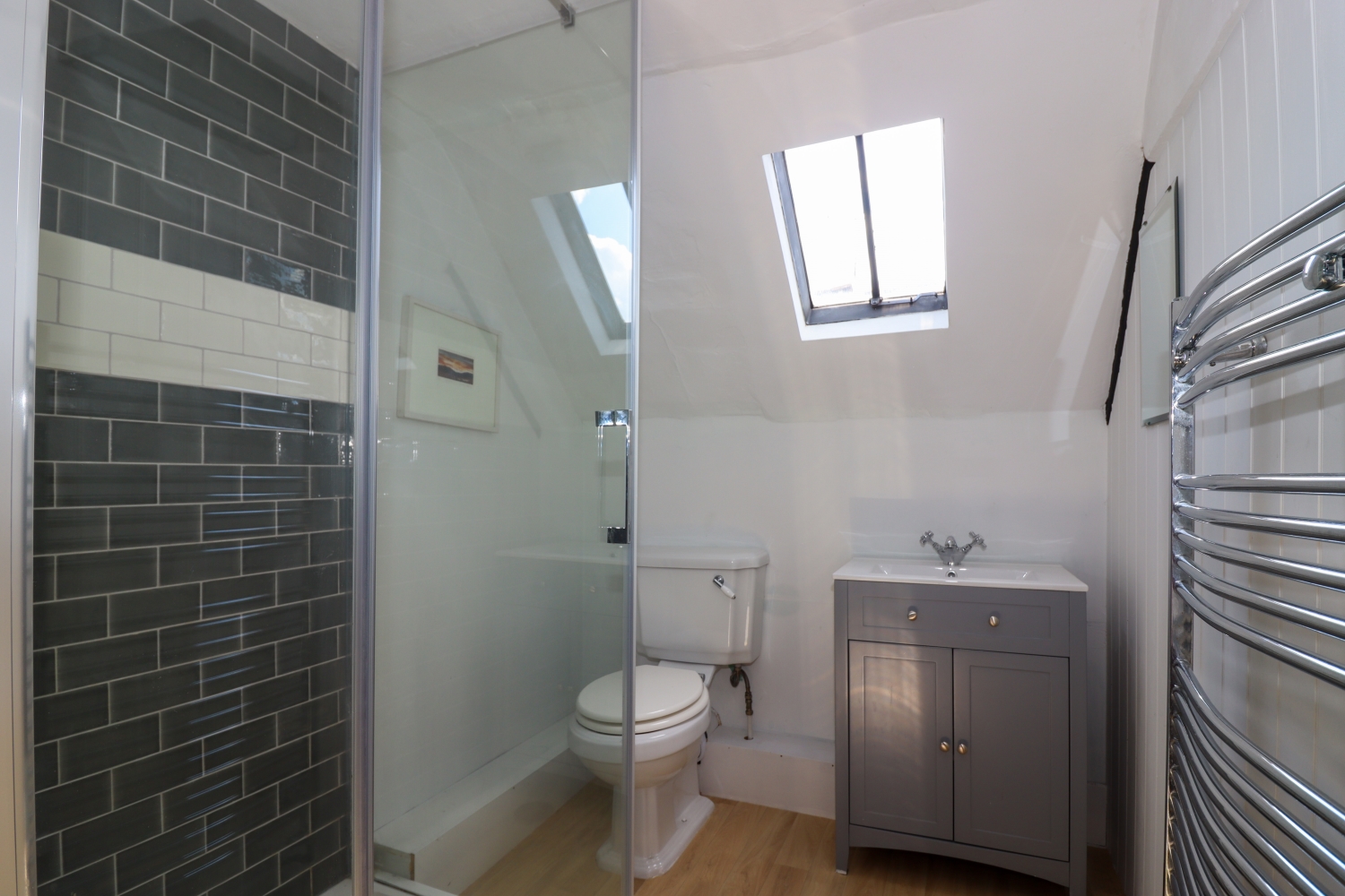 Upstairs, is an attractive landing with a skylight window and door to the shower room, which has been completely re-fitted with a large glass-sided shower cubicle, a free-standing sink unit with storage below, a wc and heated towel rail. The large double bedroom has a beamed ceiling and windows to front and rear.