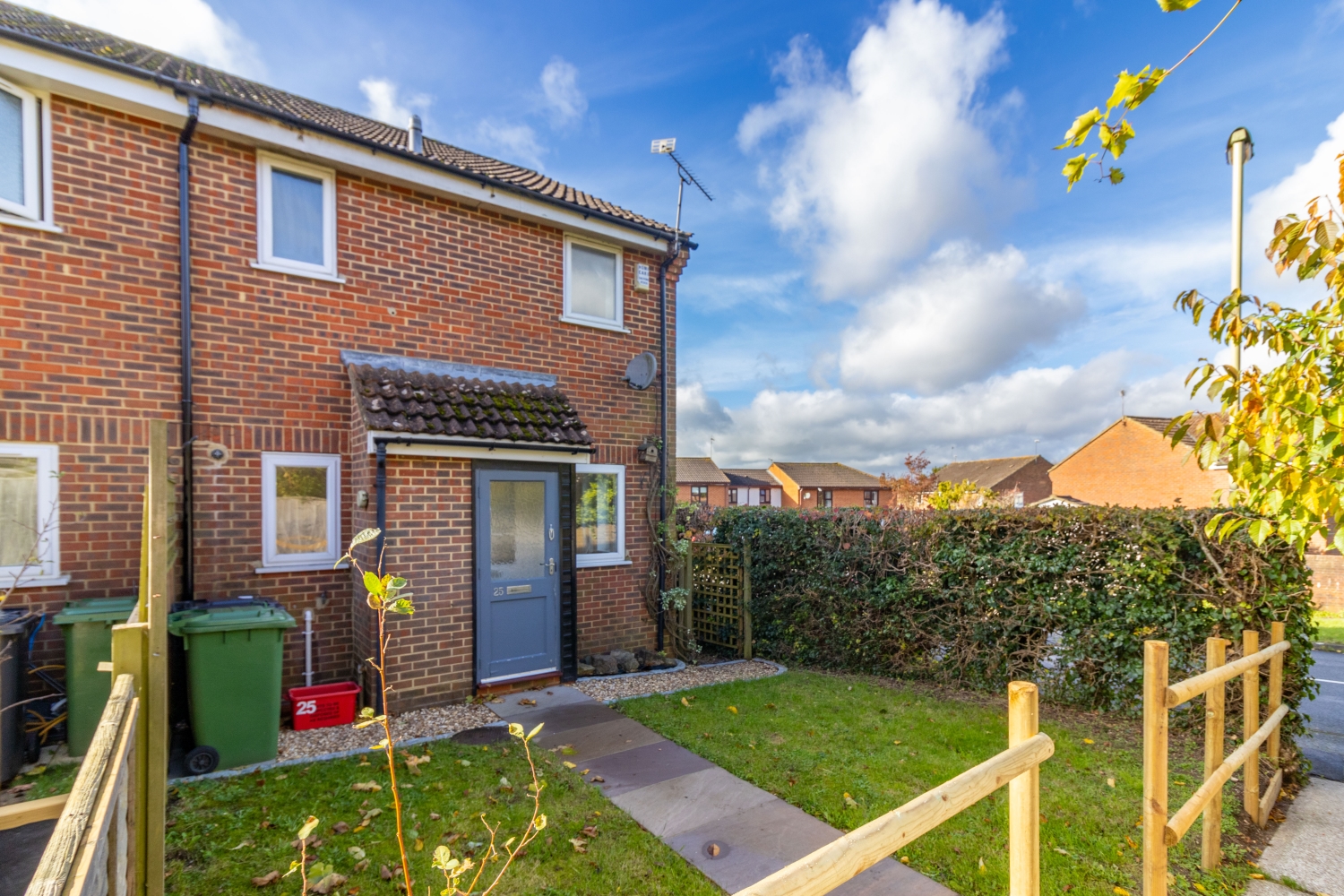To the front is a private garden, with front path and small storage unit to the side. There is an allocated parking space.