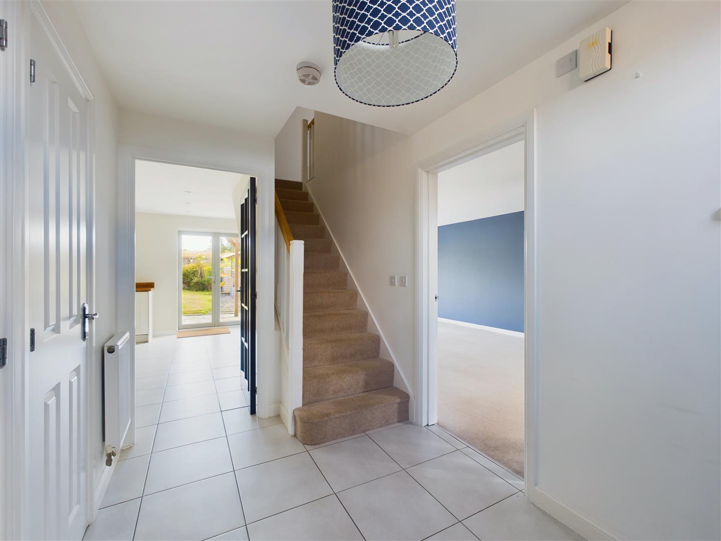 Tiled flooring, staircase to first floor landing, glass doors to sitting room and kitchen, radiator, guest cloakroom, large walk in coat cupboard, telephone points in hall and cupboard.