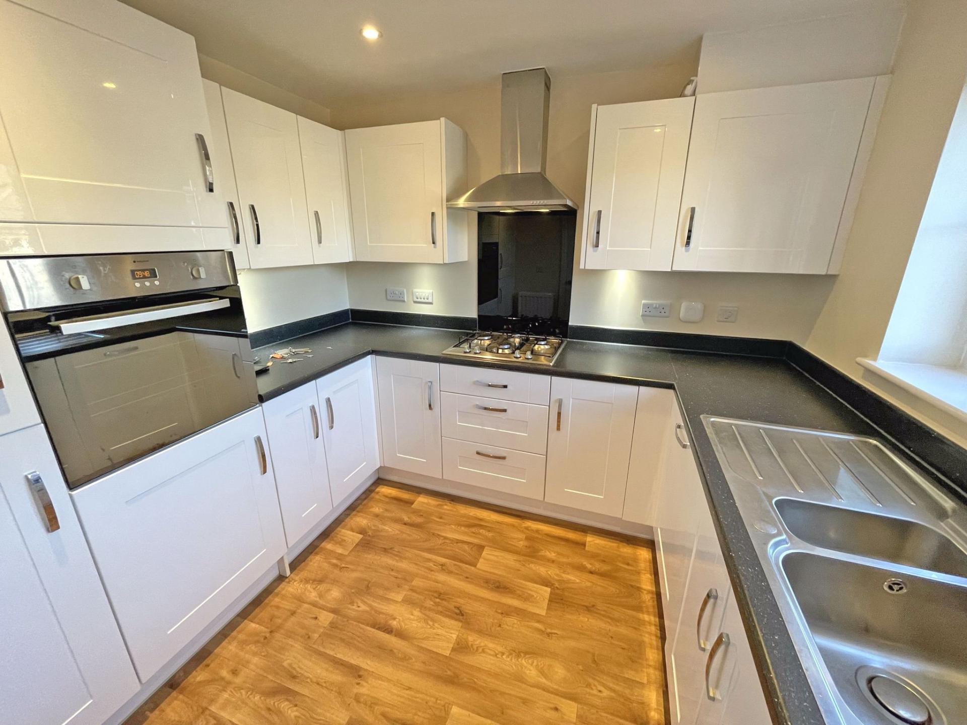 2.76m (9’) x 2.68m (8’09) uPVC window to the front aspect with blind. LED down lights. Modern fitted kitchen comprising a range of floor standing and wall mounted cupboards with white gloss door and drawer fronts. Slate colour worktops and upstands. Stainless steel four burner gas hob with stainless steel cooker hood over. Single stainless finished electric oven incorporating grill. Integrated dish washer, fridge/freezer and washing machine. One and a half bowl stainless steel sink incorporating drainer. Cupboard containing gas fired Potterton system boiler. Further cupboard containing fuse board. Radiator. Lino floor covering.