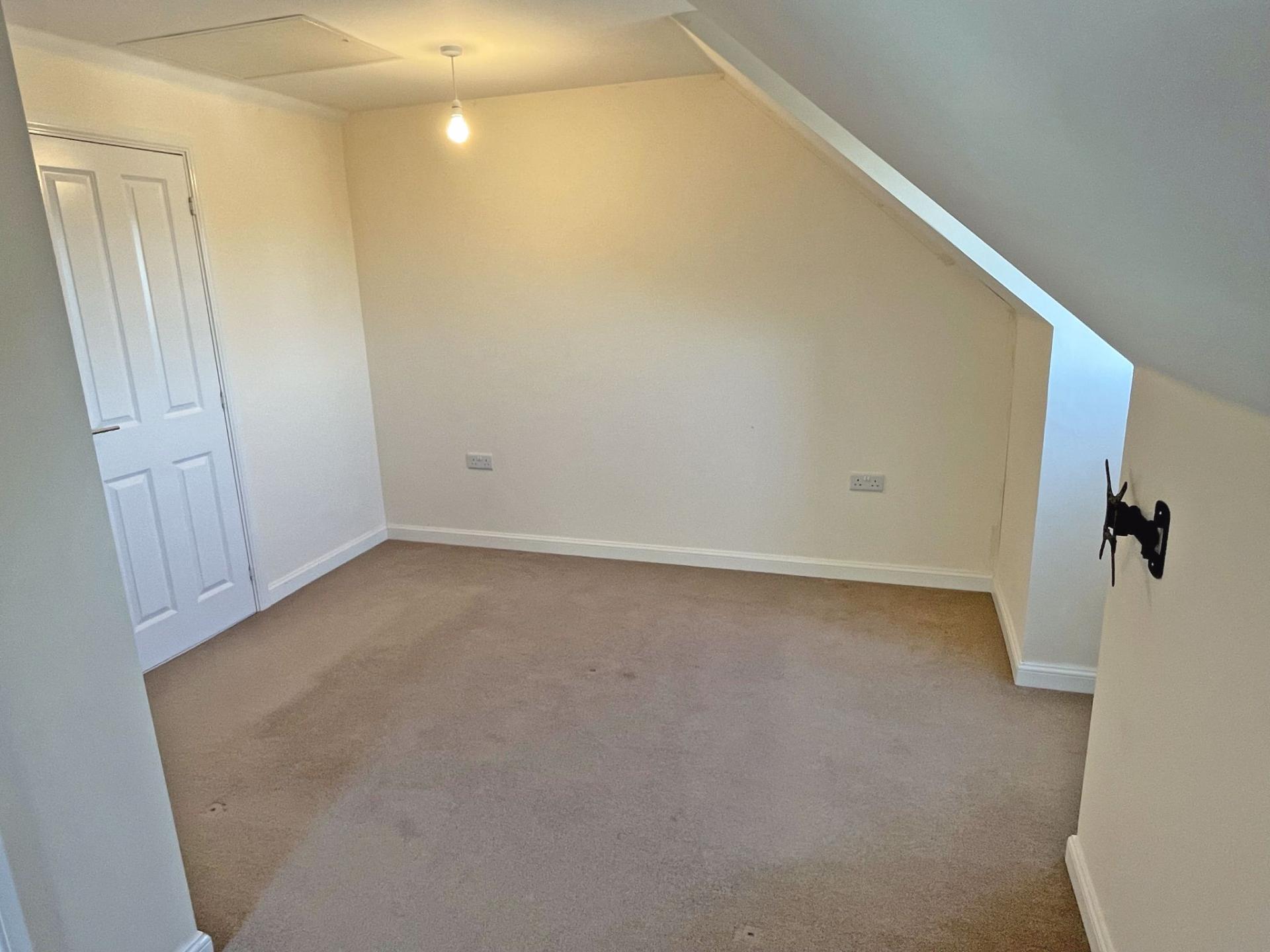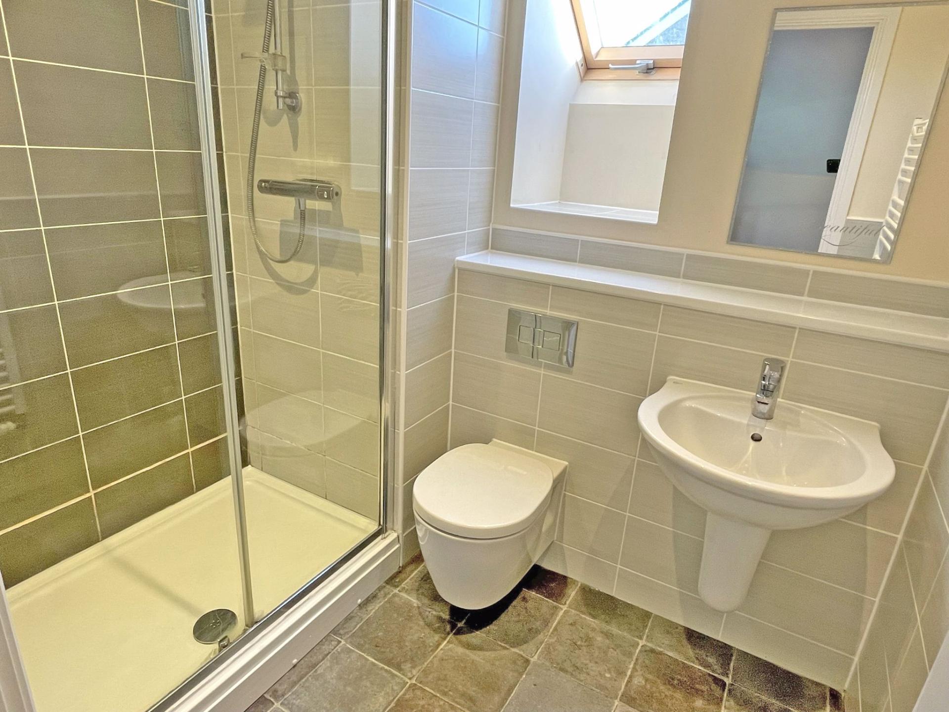with no door. 3.84m (12’07) reducing 2.62m (8’07) x 3.24m (10’07) reducing to 1.89m (6’02). Part sloping ceilings. Dorma window with uPVC double glazed window to the front aspect and roller blind. Radiator. Carpet. TV point. Danfoss heating stat and programmer for the first and second floor zones. Pair of doors to wardrobe with hanging rails and shelf. Door to en suite shower room with Velux window. Part tiled walls. Large shower cubicle with fully tiled walls internally. Glazed sliding door. Wall hung WC and concealed cistern. Wall hung wash basin. LED down lights. Lino flooring. Ceiling extractor. Ladder heated towel rail. Shaver point.