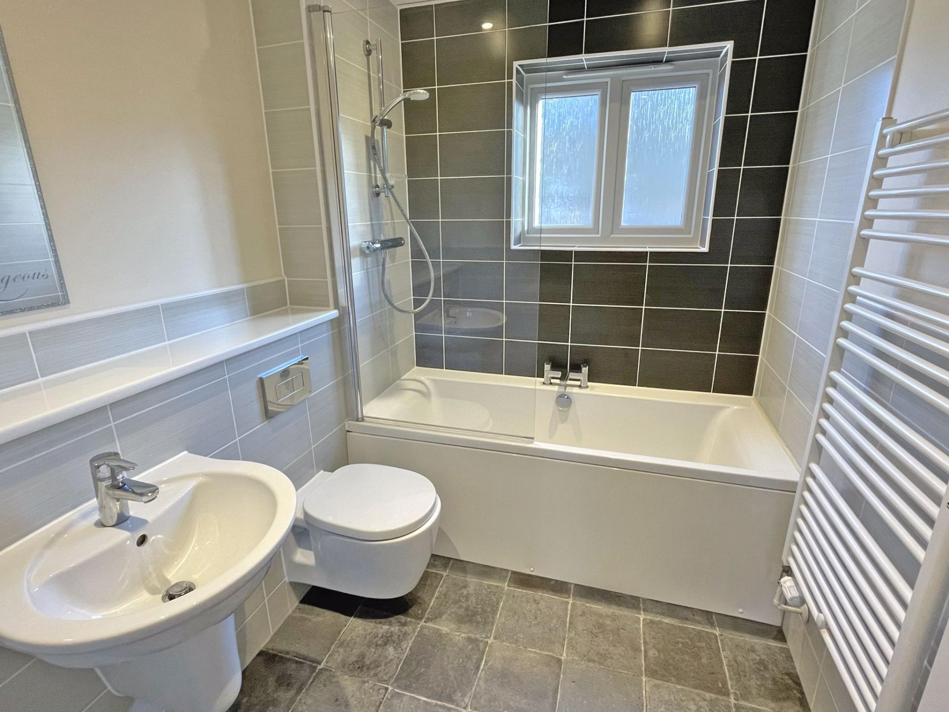Obscure uPVC window to rear aspect. Part tiled walls in a combination of dark and light grey. White bathroom suite comprising panelled bath with fully tiled walls over. Glazed shower screen. Ideal shower with exposed mixer valve with shower rose and riser rail. Wall hung WC with concealed cistern. Wash hand basin. Lino floor covering. LED down lights. Ceiling extractor. Heated ladder towel rail.
