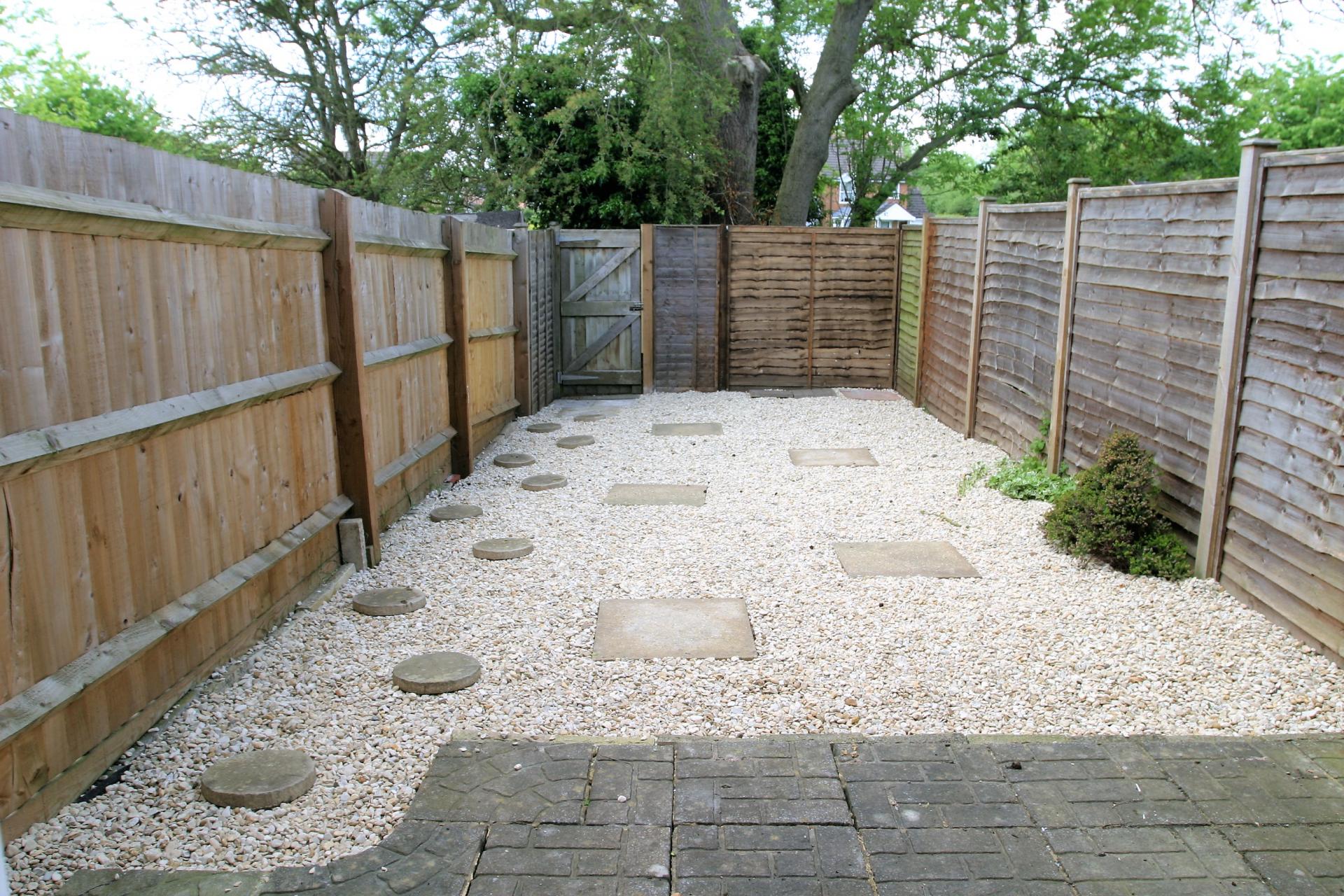 The living room is laid with fitted carpet and enjoys plenty of natural light, with sliding patio doors opening directly onto the enclosed rear garden. The garden is designed for low maintenance, predominantly laid to gravel with a small patio area and stepping stones leading to a rear gate, which provides direct access to the open green space beyond.