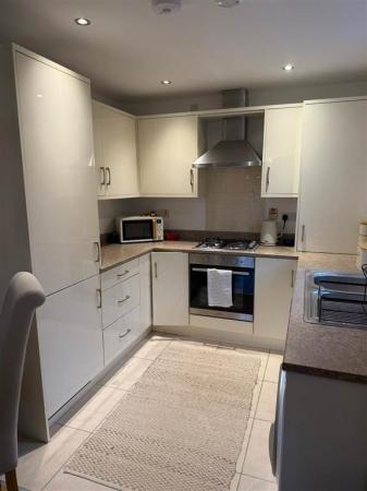 - Kitchen with white gloss units and integrated appliances