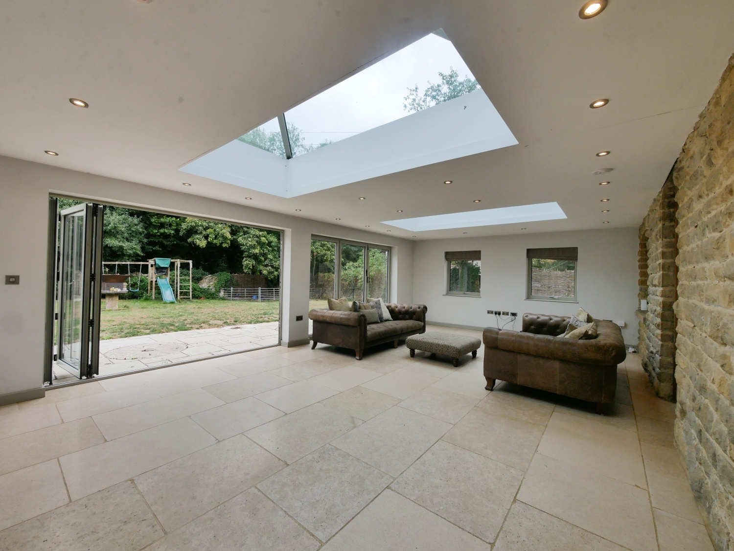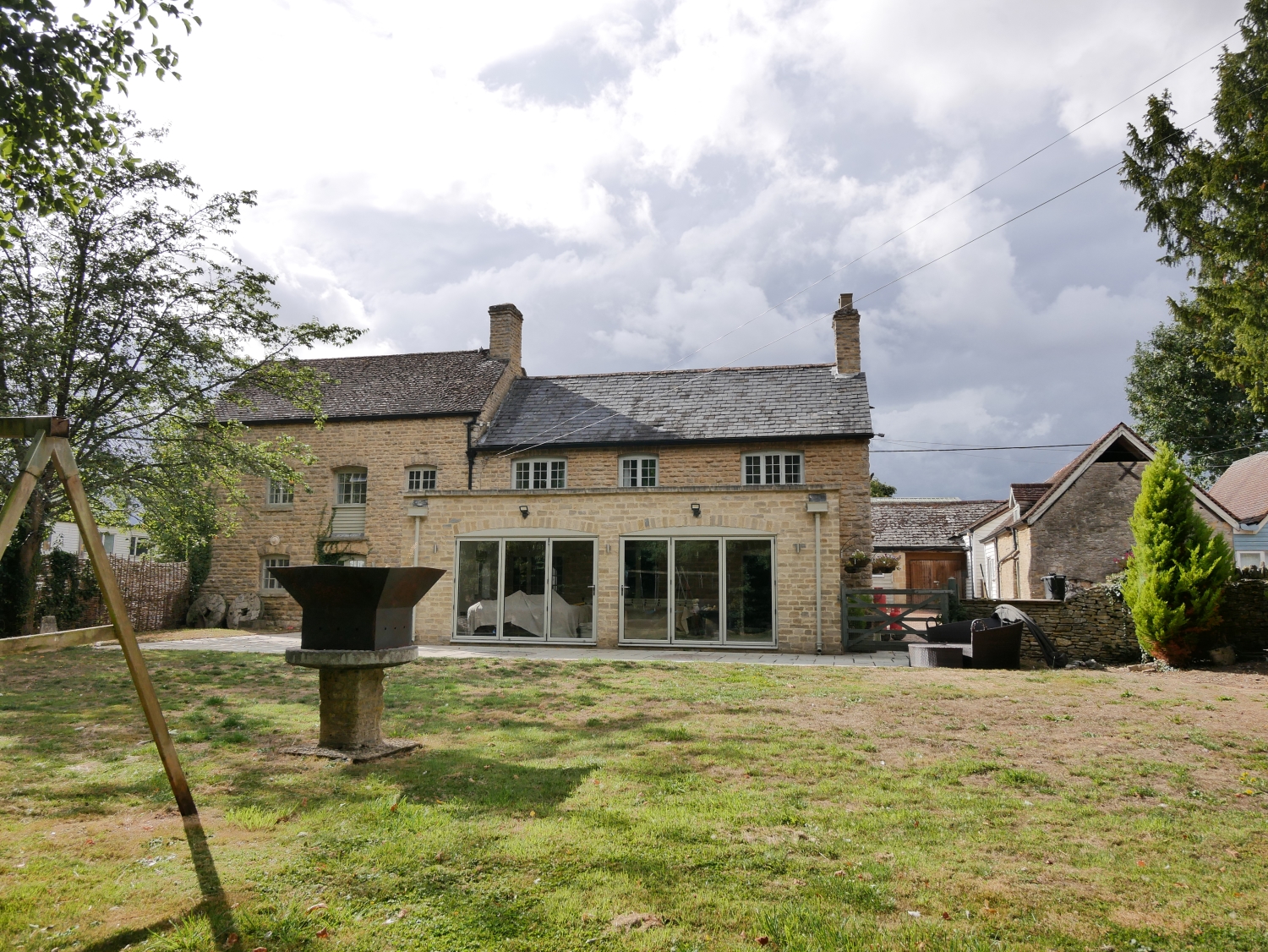 Beautiful Stone Family Home Blending Period Charm with Contemporary Design. Set in a desirable village location, this beautifully presented stone-built property combines character features with a modern extension, offering over 3,000 sq. ft. of versatile accommodation. The ground floor includes a spacious kitchen/breakfast room with central island and integrated appliances, a formal dining room, large sitting room with fireplace, study, utility, and shower room. At the heart of the home is a stunning family room with exposed stonework, skylights, and bi-fold doors opening onto the terrace and garden, creating a seamless connection between indoor and outdoor living.