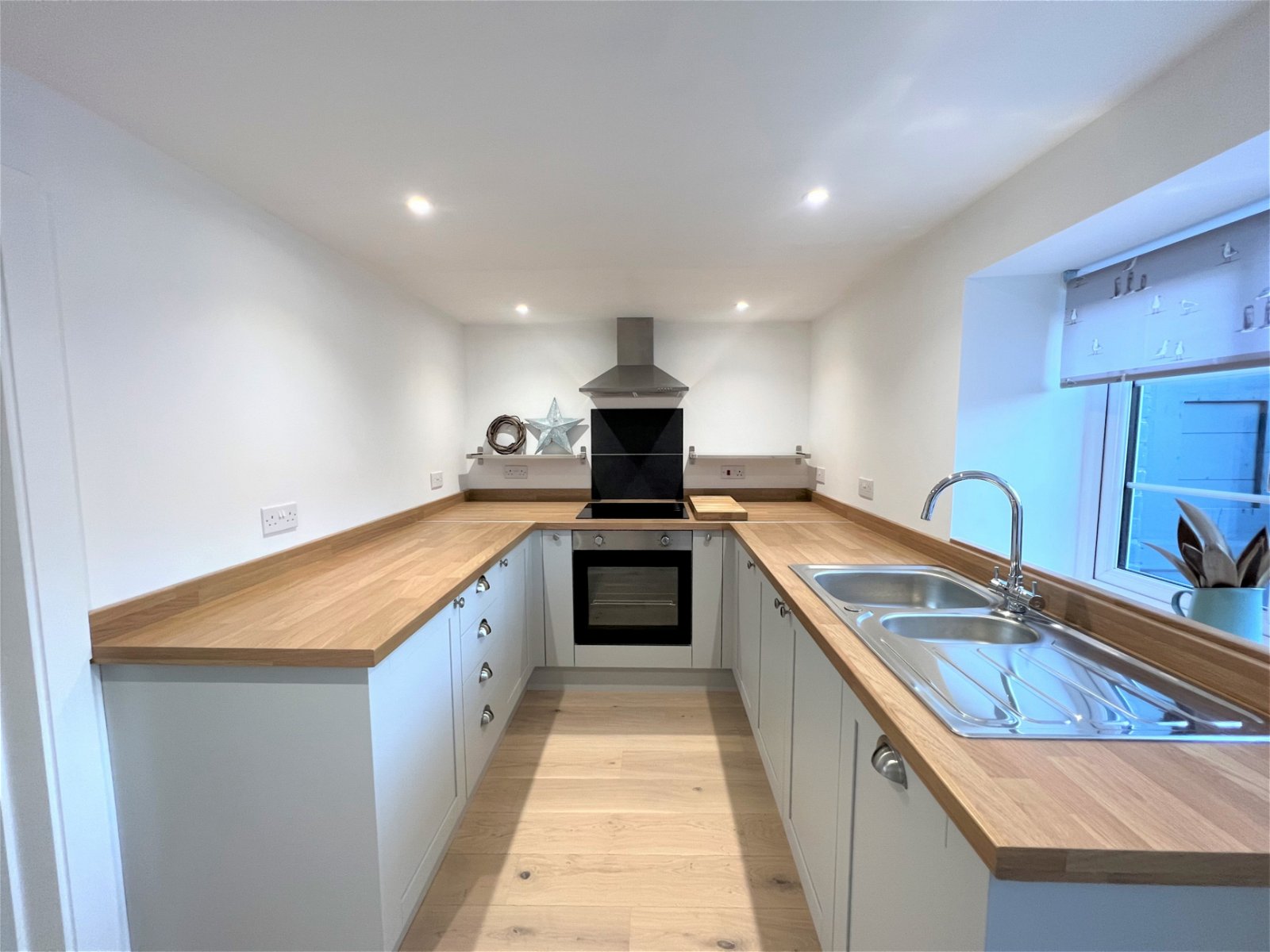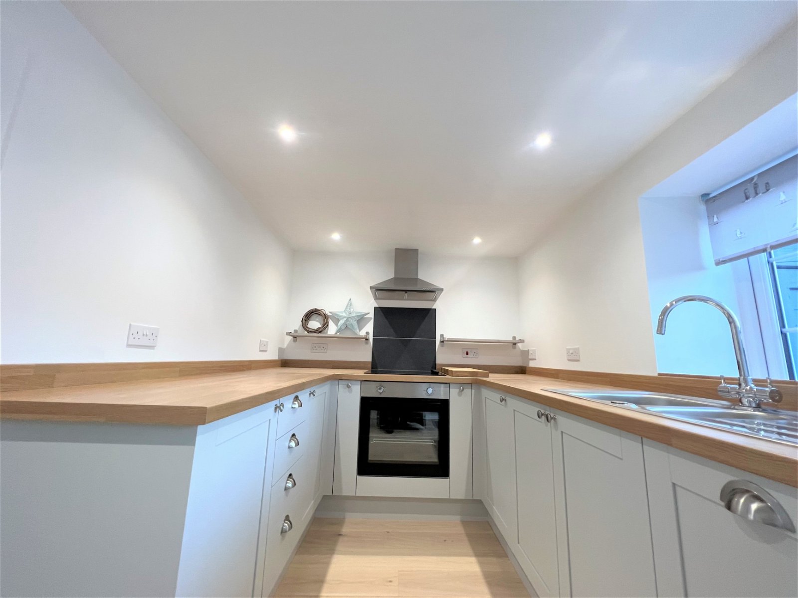 Presented with a recently fitted range of modern wall and base units, with a complimentary wooden work surface, which in turn incorporates a stainless-steel sink and drainer unit with a mixer tap over. The room has tiled splash backs and appliances which include a four-ring electric hob, with an oven beneath and an extractor hood over and an integrated dishwasher. There is space under the stairs for a free standing fridge freezer. There is a double glazed window, a central heating radiator and a Upvc entrance door which opens onto the rear yard. Stairs rise to the first floor from the kitchen.
