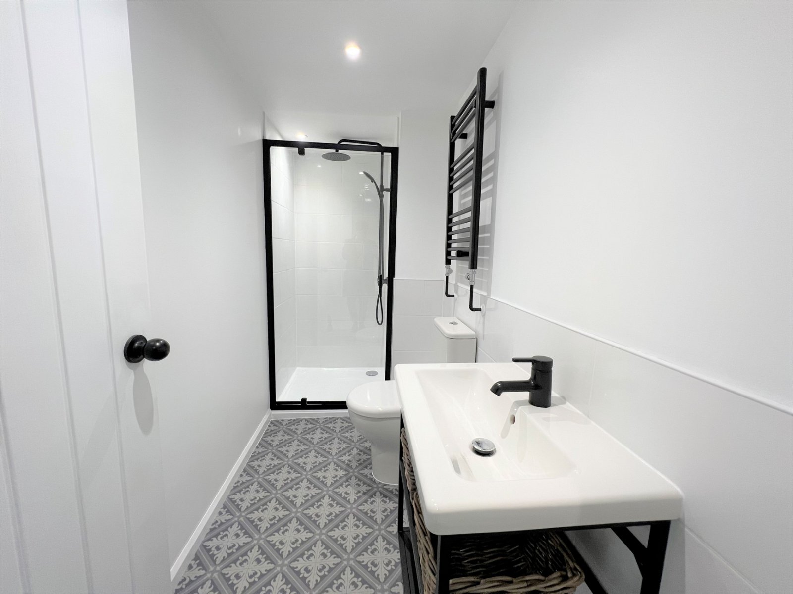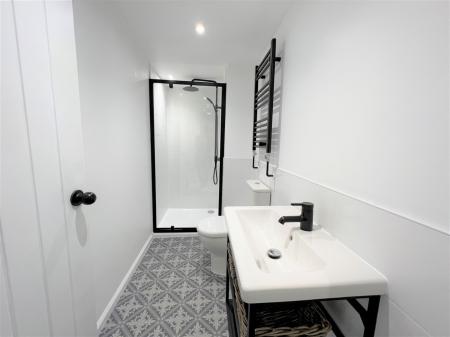 Presented with a recently fitted three piece suite finished in white, comprising a step-in shower, a low flush W.C, a wash hand basin set to a vanity unit with useful storage beneath. The bathroom has partial tiling to the walls, spot lighting to the ceiling and a chrome towel radiator.