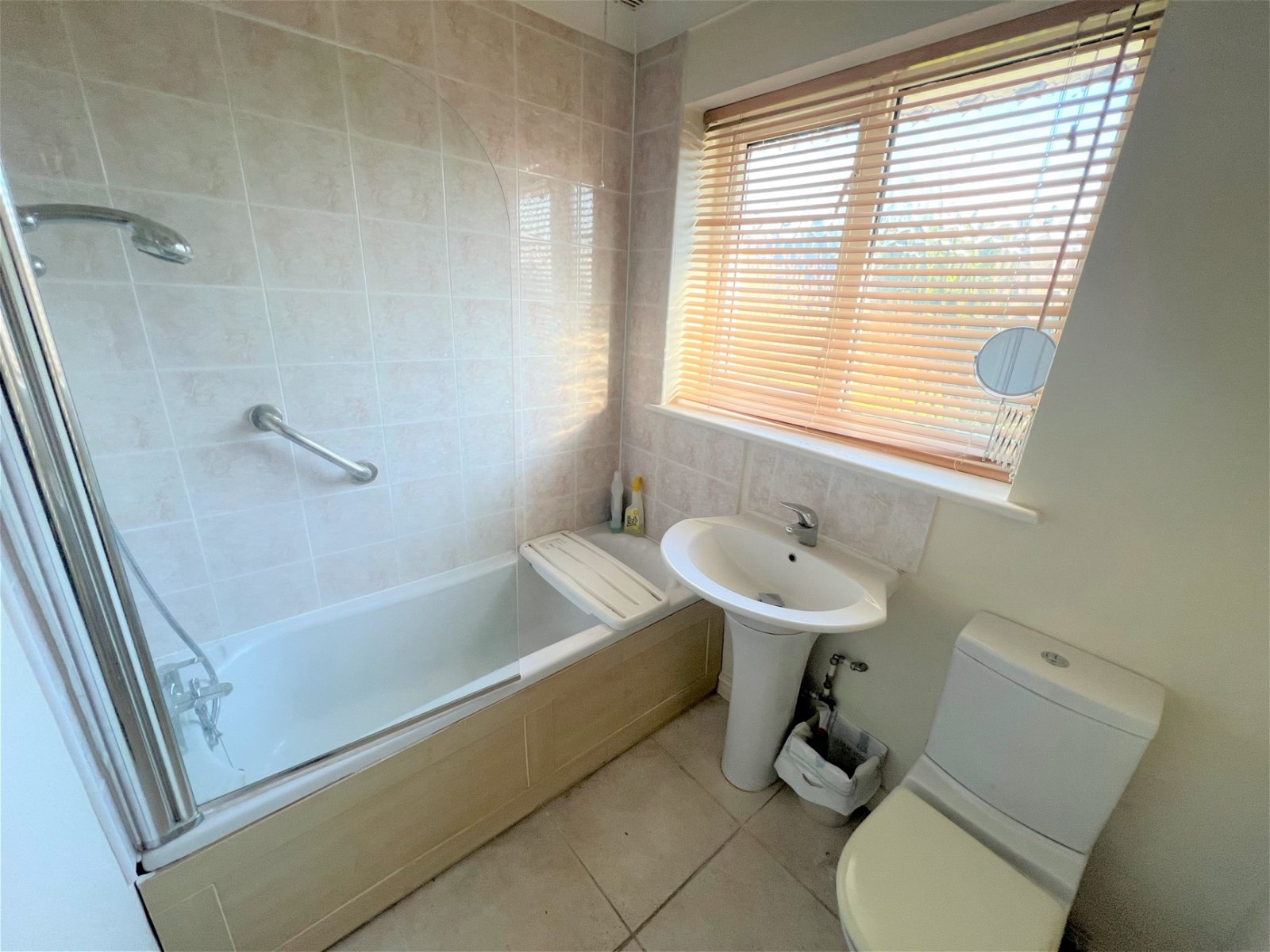 Featuring a three piece suite finished in white, comprising, comprising a panelled bath with a shower over and a fixed glass screen, a low flush W.C and a pedestal wash hand basin. The room has partial tiling to the walls, full tiling to the floor, a chrome towel radiator and an Opaque double glazed window.