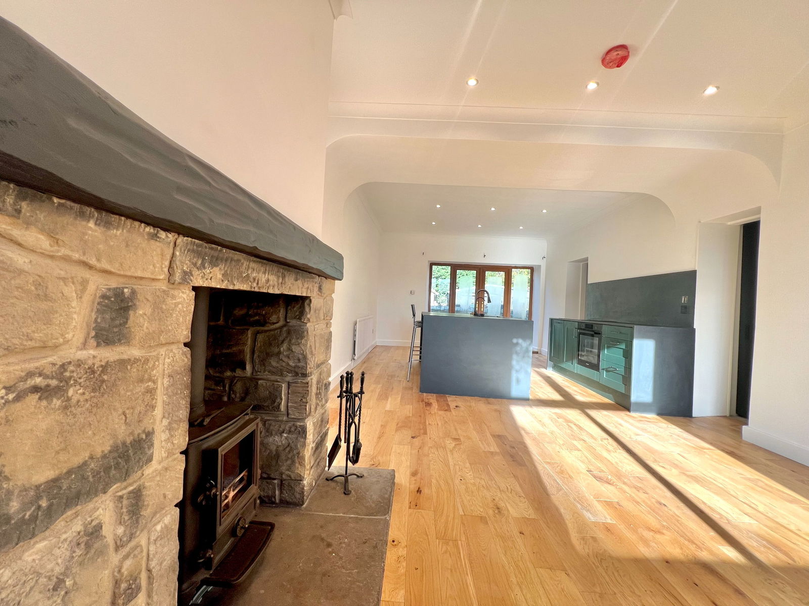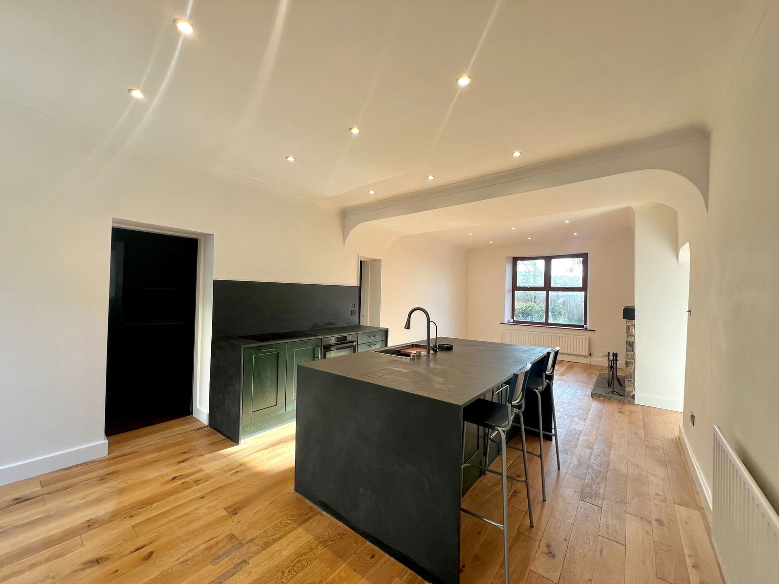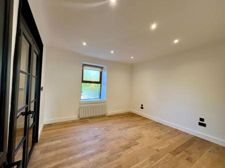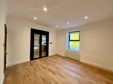 An expansive, modern kitchen and dining space, perfect for entertaining. With both front and rear-facing windows, two central heating radiators, and wood flooring extending from the living room, this flexible area is both stylish and functional. The kitchen boasts a central island with a sink and draining unit, ample storage in base units, a four-ring electric induction hob, integrated oven, slimline dishwasher, and two storage pantry cupboards—one that houses a fridge-freezer. A charming exposed stone fireplace adds a touch of warmth and character to this area. There is also access to a convenient downstairs cloakroom, which includes a low-flush WC and washbasin in a sleek vanity unit.