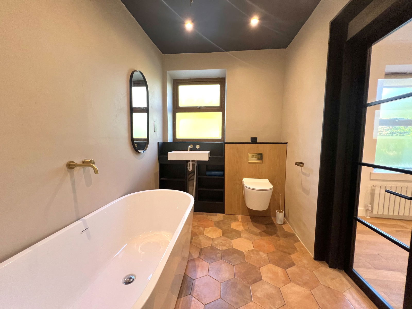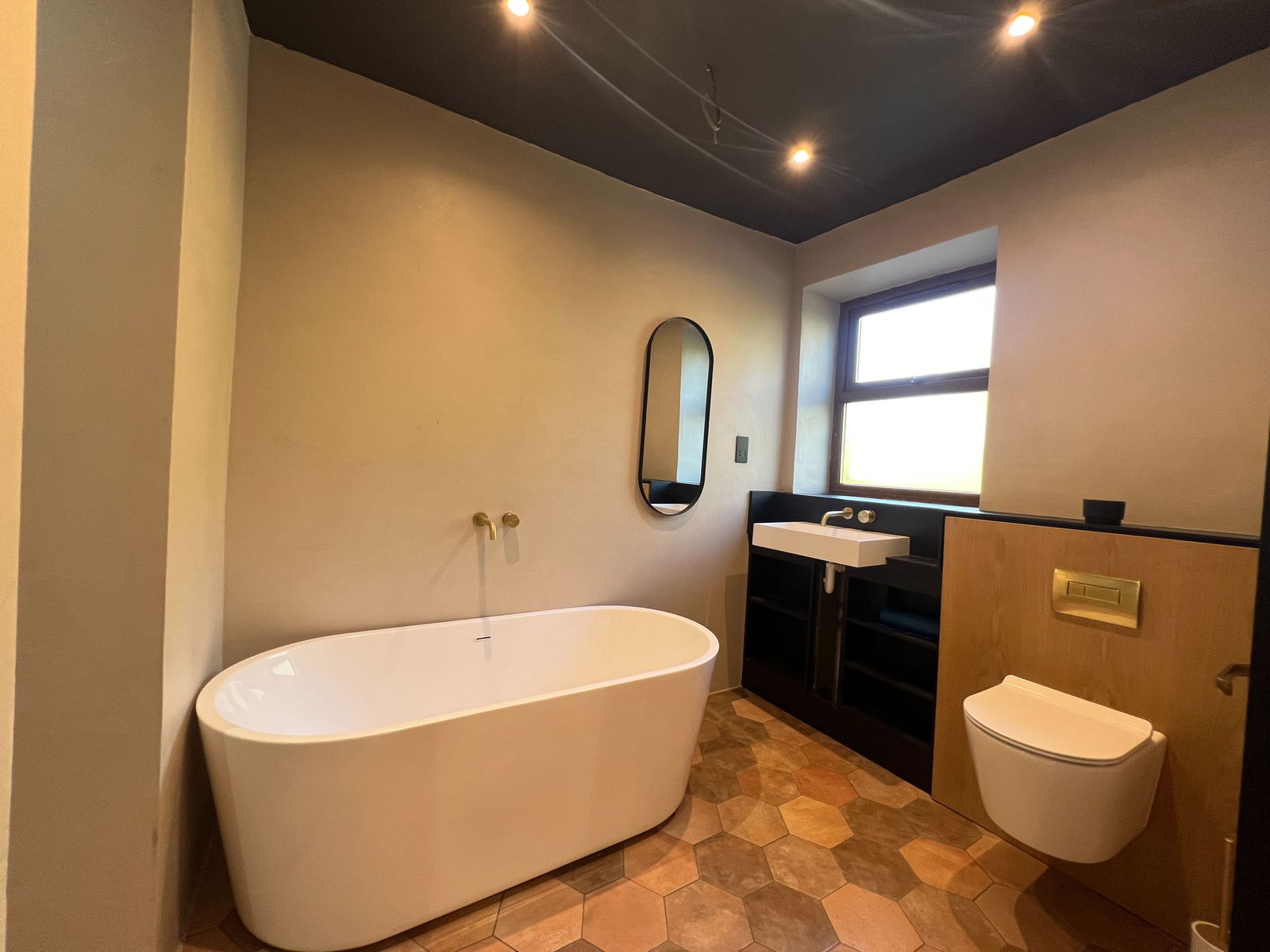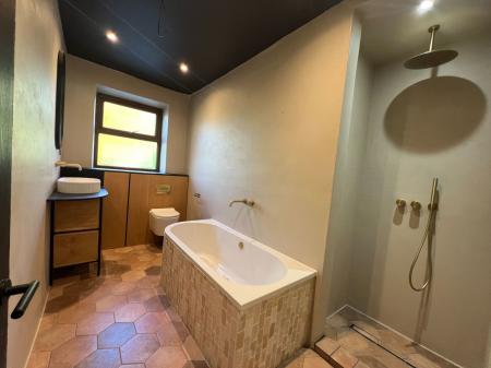 Reflecting the style of the en-suite, the family bathroom features a four-piece suite, including a large tiled bathtub, a step-in rainfall shower, a low-flush WC, and a washbasin set into a vanity unit. The bathroom is fully tiled, has an obscure rear-facing double-glazed window, and is finished with ceiling spotlights.