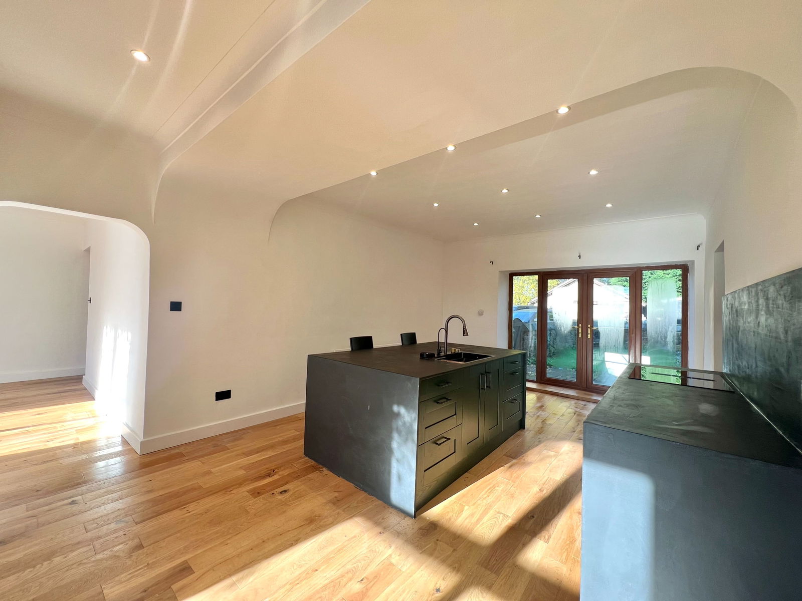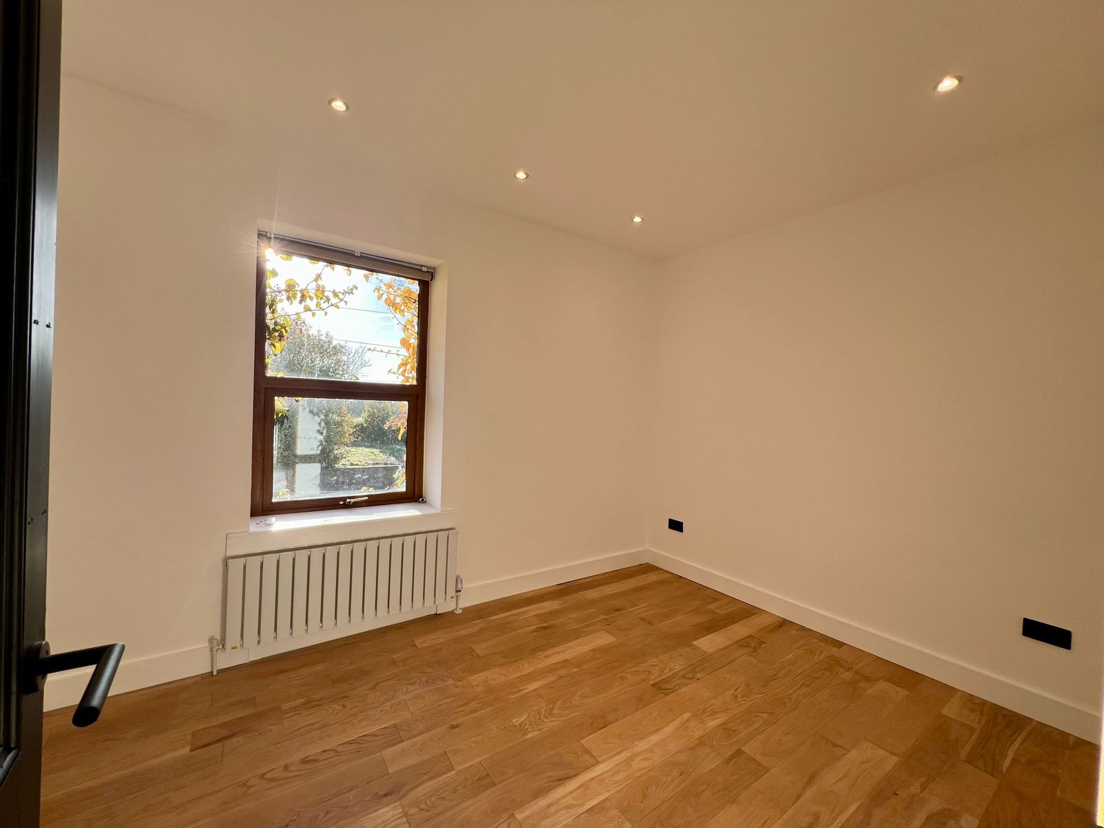 A spacious, front-facing living room with a double-glazed window and central heating radiator. This room is open-plan, flowing seamlessly into the kitchen-dining area, creating an ideal space for gatherings.