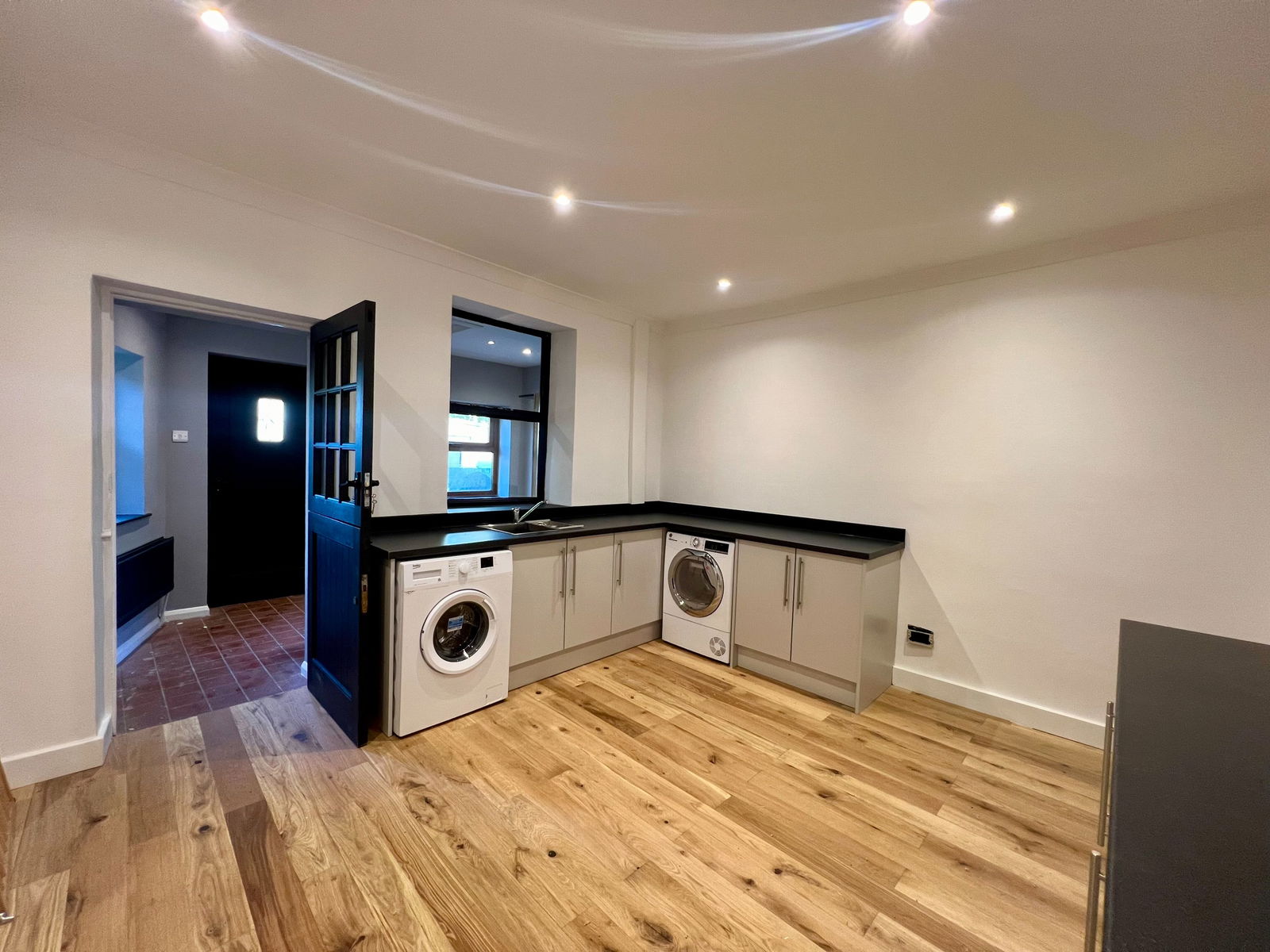A well-sized utility room featuring modern grey base units paired with a sleek black roll-edge countertop. The room includes a stainless steel sink with a mixer tap, space for an automatic washing machine and dryer, and access to a convenient storage area that also provides cellar access. A central heating radiator and a single glazed window overlooking the entrance hall add to the room’s functionality. The utility room then flows into the living room.
