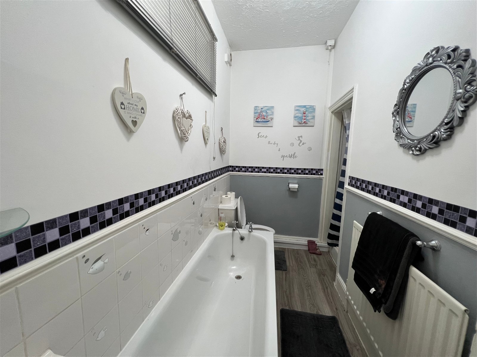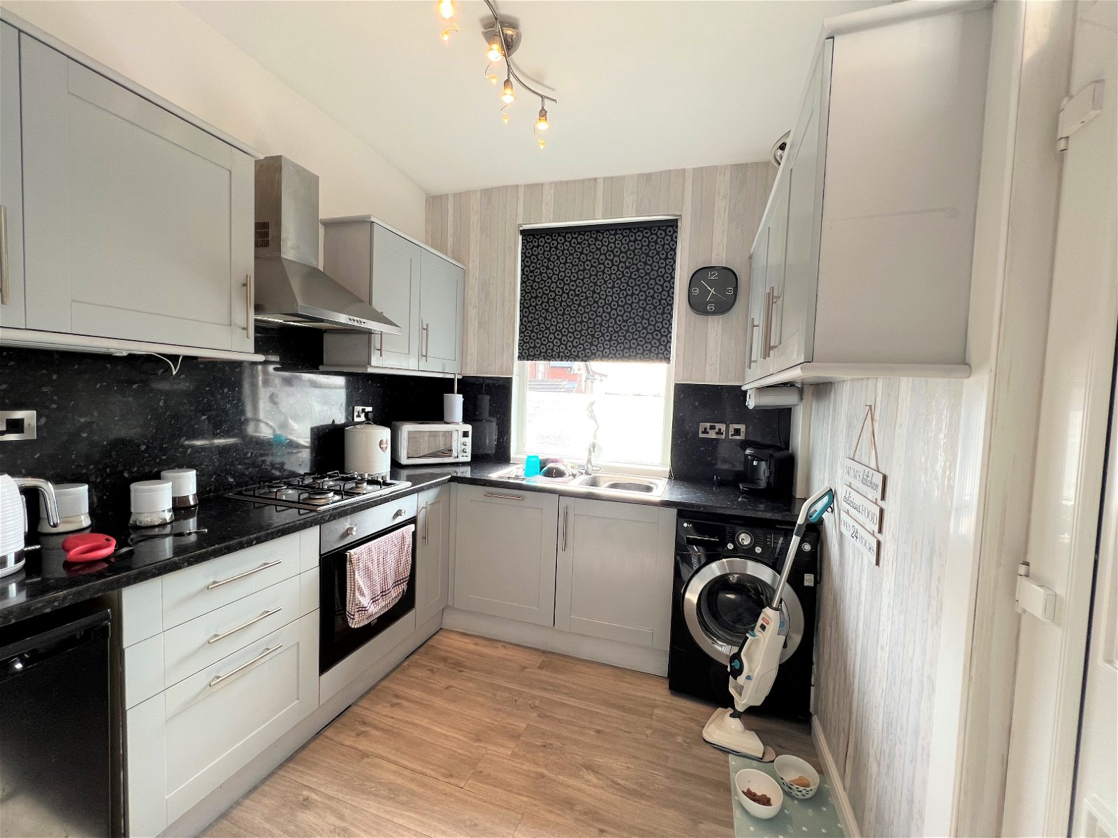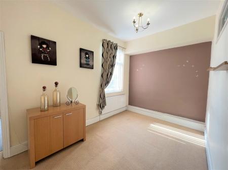 Positioned to the rear of the property having a range of wall and base units, with a complimentary work surface, with splash backs which in turn incorporates a stainless-steel sink and drainer with a mixer tap over. Appliances include an integrated fan assisted electric oven, a four-ring gas hob with an extractor hood over, a dishwasher, an under counter fridge. The room has a double-glazed window, a modern Chrome radiator and a Upvc entrance door giving access to the rear yard.
