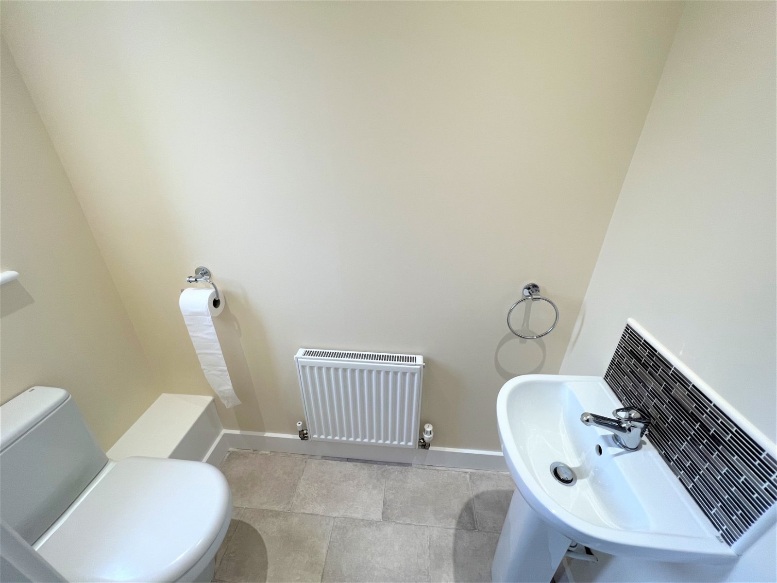 Presented with a tow piece suite finished in white, comprising a low flush W.C and a pedestal wash hand basin with a tiled splash back. There is a central heating radiator, spot lights to the ceiling and an obscure front facing double glazed window.