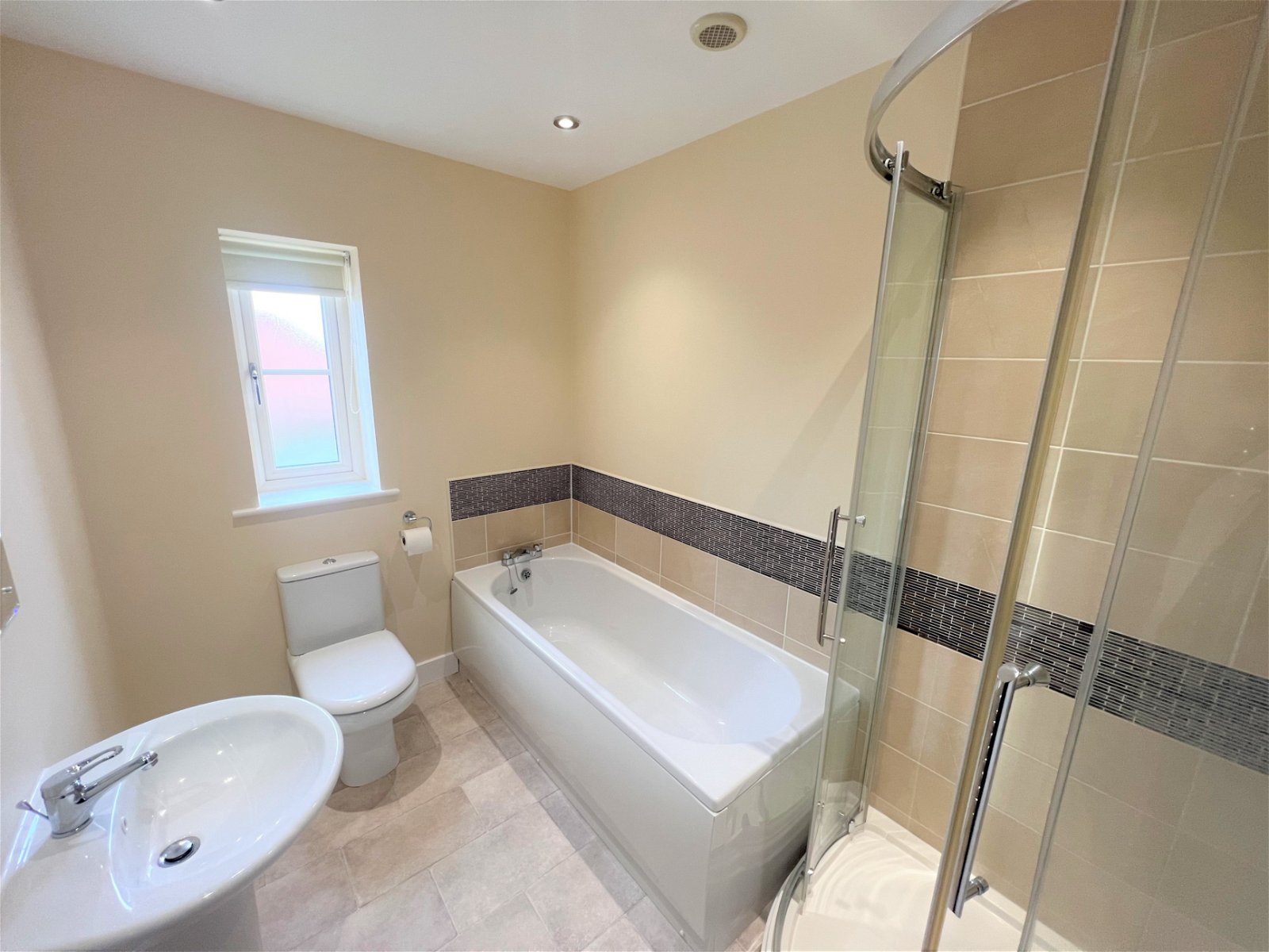 Featuring a four piece suite finished in white, comprising a panelled bath, a corner step-in shower unit, a low flush W.C and a pedestal wash hand basin. The room has a side facing obscure double glazed window, partial tiling to the walls, spot lights to the ceiling and a chrome towel radiator.
