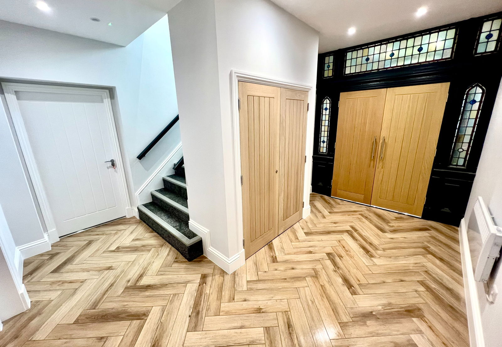An impressive communal reception  hall has twin doors, which sit within an original stained-glass surround and gain access to Apartment one.