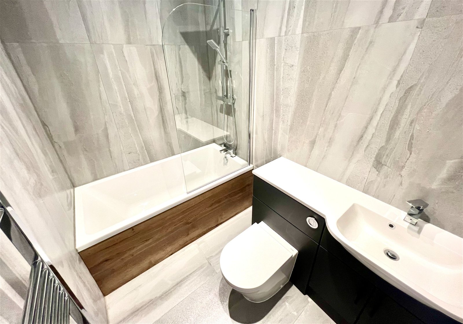 The bathroom is presented with a modern three-piece suite, with full tiling to both the walls and floor.