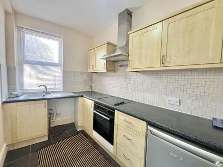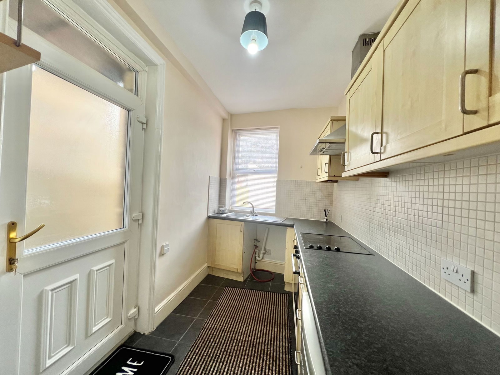 The kitchen is fitted with a range of wall and base units complemented by roll-edge worktops. It includes a stainless steel sink with mixer tap, a four-ring electric hob, built-in oven, extractor hood, and space for a washing machine and fridge-freezer. A rear-facing double-glazed window provides pleasant views of the garden, and a UPVC door offers direct garden access. Central heating radiator and partial wall tiling complete the space.