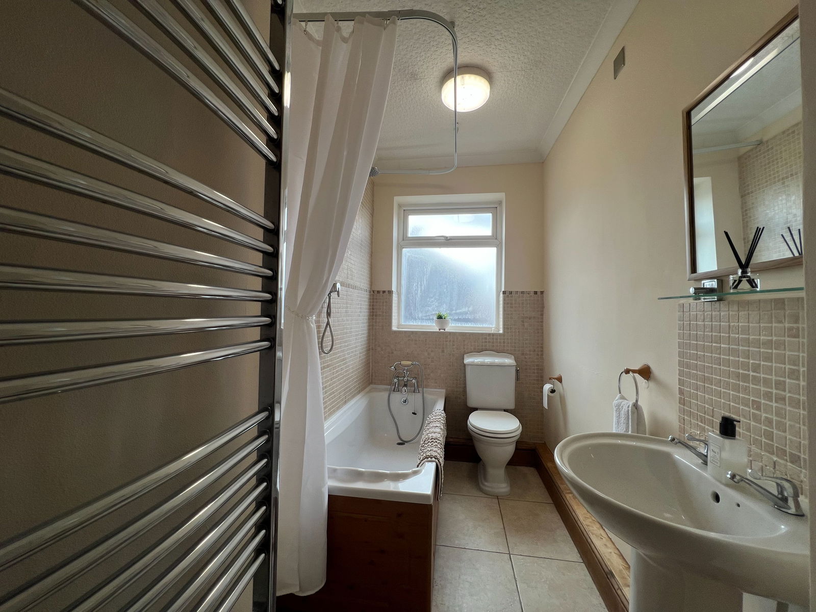 This stylish and well-appointed bathroom features a white three-piece suite, including a panelled bath with overhead shower, pedestal wash basin, and low-flush WC. Finished with a chrome towel radiator, full floor tiling, and partial wall tiling, plus an obscure-glass rear-facing window for natural light and privacy.